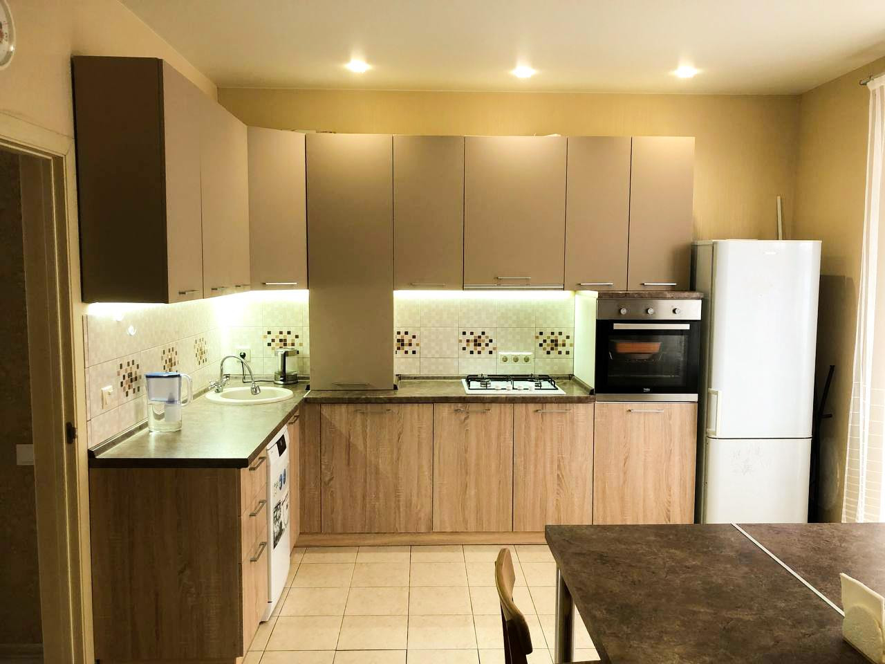 На первом этаже: большая просторная светлая гостиная и 20-метровая кухня, в которой легко и свободно помещаются и хозяева и гости. Также на первом этаже располагается гостевой санузел.