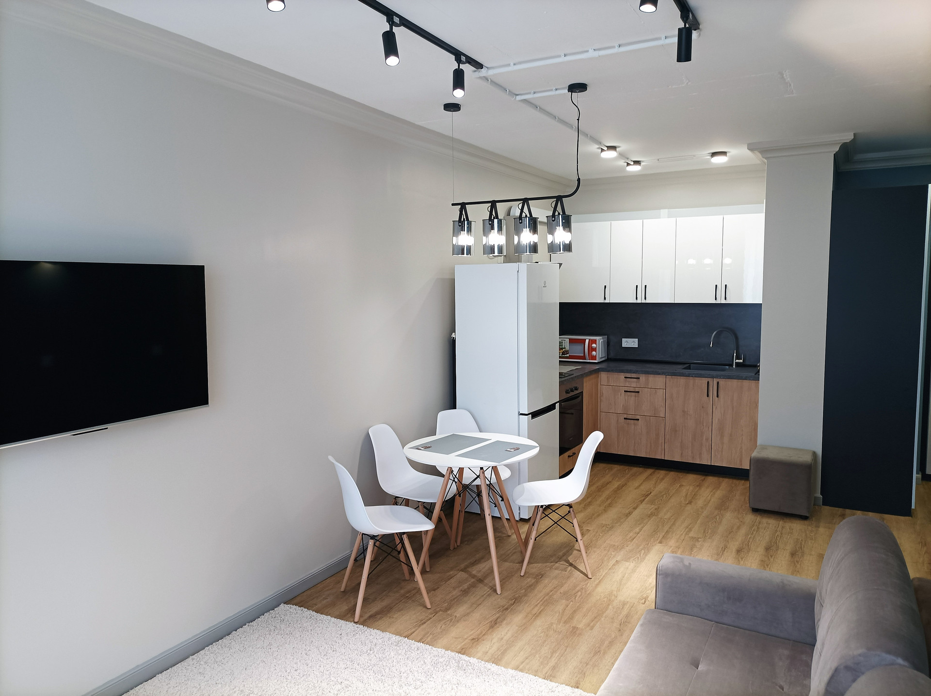 кухонный гарнитур, микроволновка, телевизор, 2 сплит-системы.