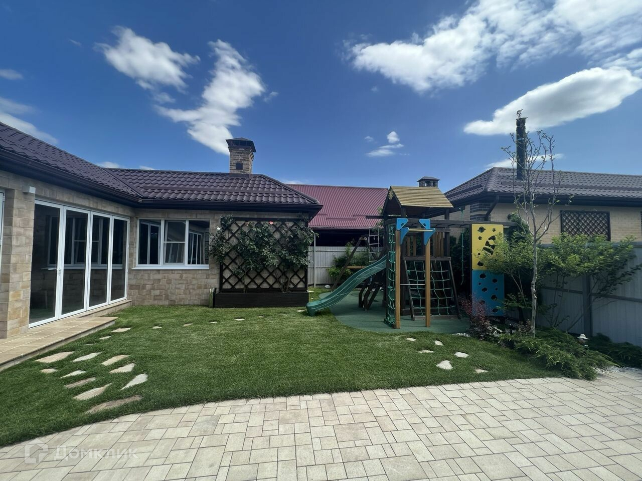 Ухоженный двор со множеством декоративных растений.