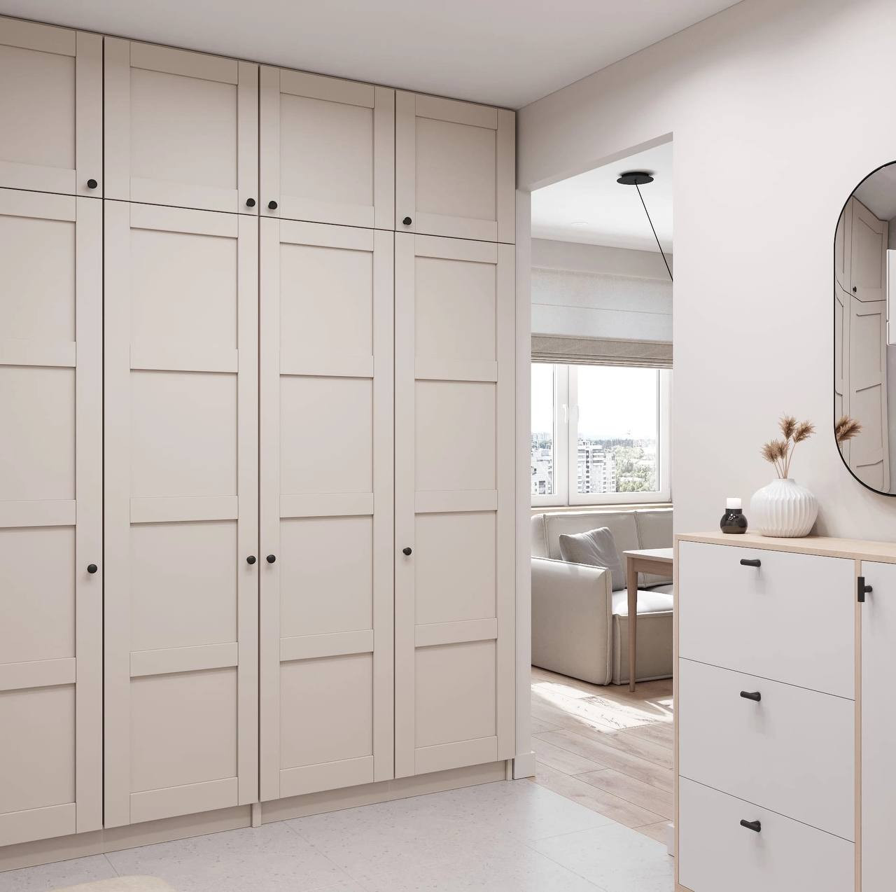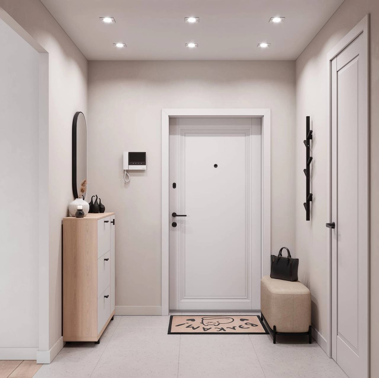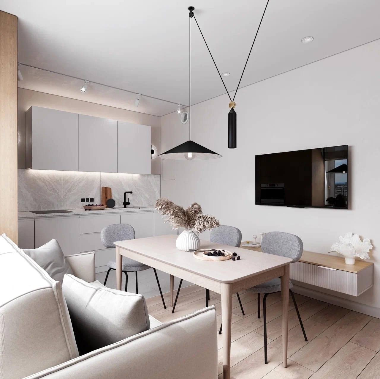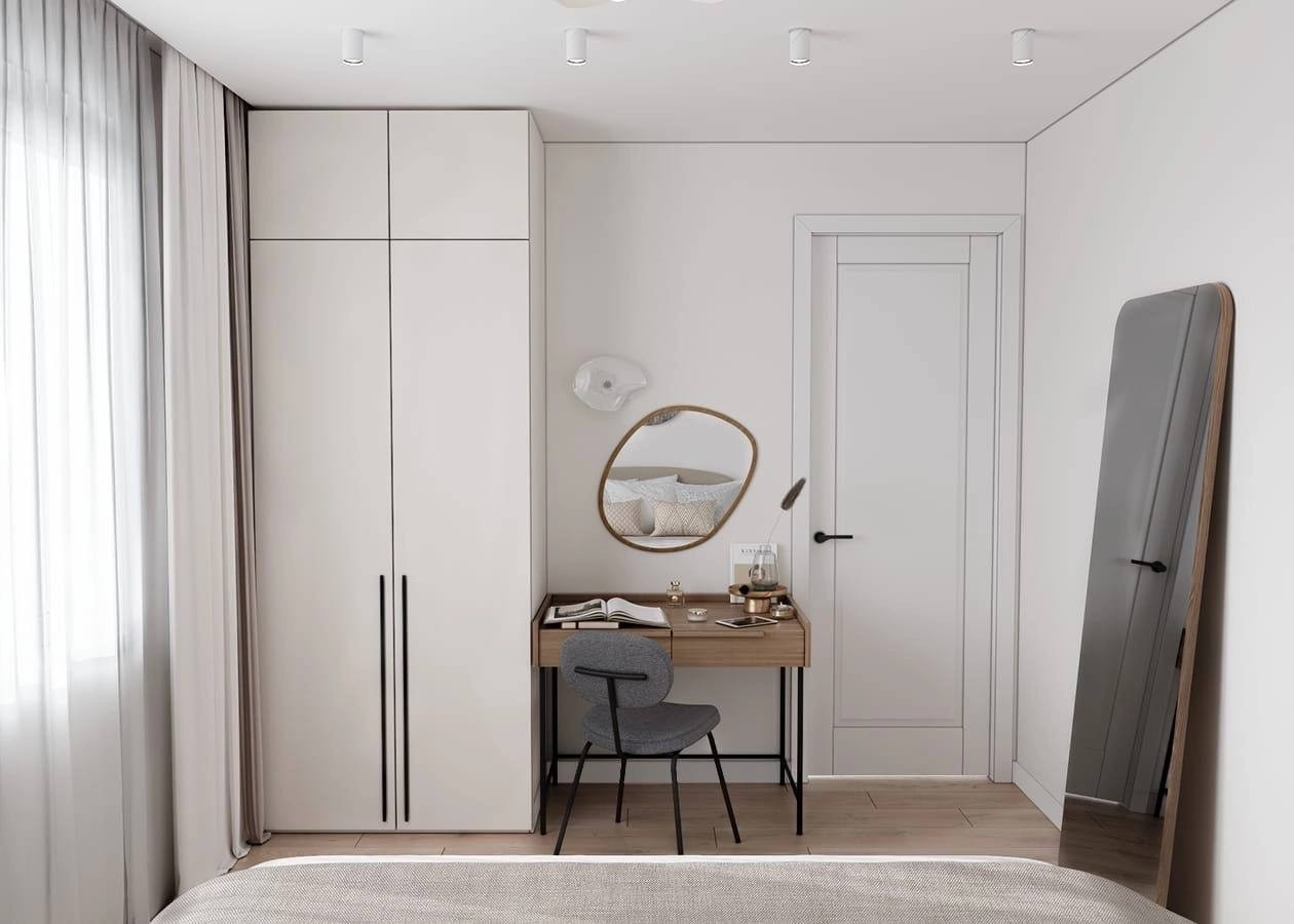 Ремонт выполнен в светлых тонах, что визуально расширяет пространство и делает его светлым и уютным. На полу ламинат, на стенах обои под покраску, а на потолке натяжная конструкция.