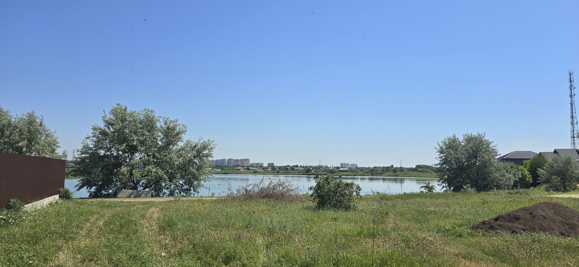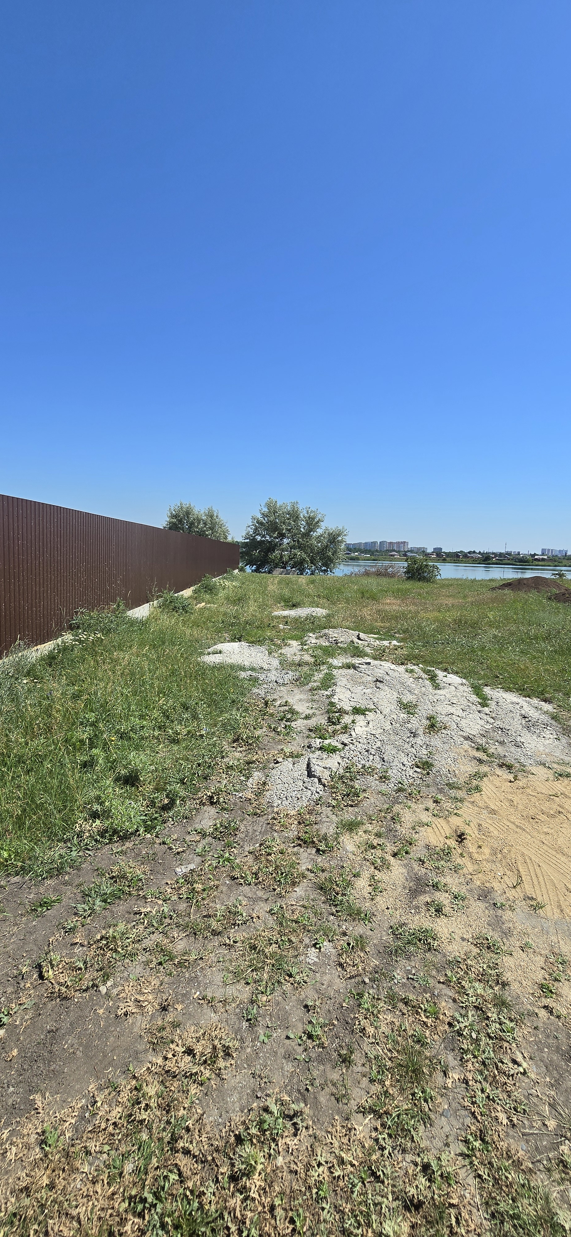 Фасад на дорогу  и озеро 25 метров, ширина 40 метров. Асфальтированный подъезд практически до самого участка.