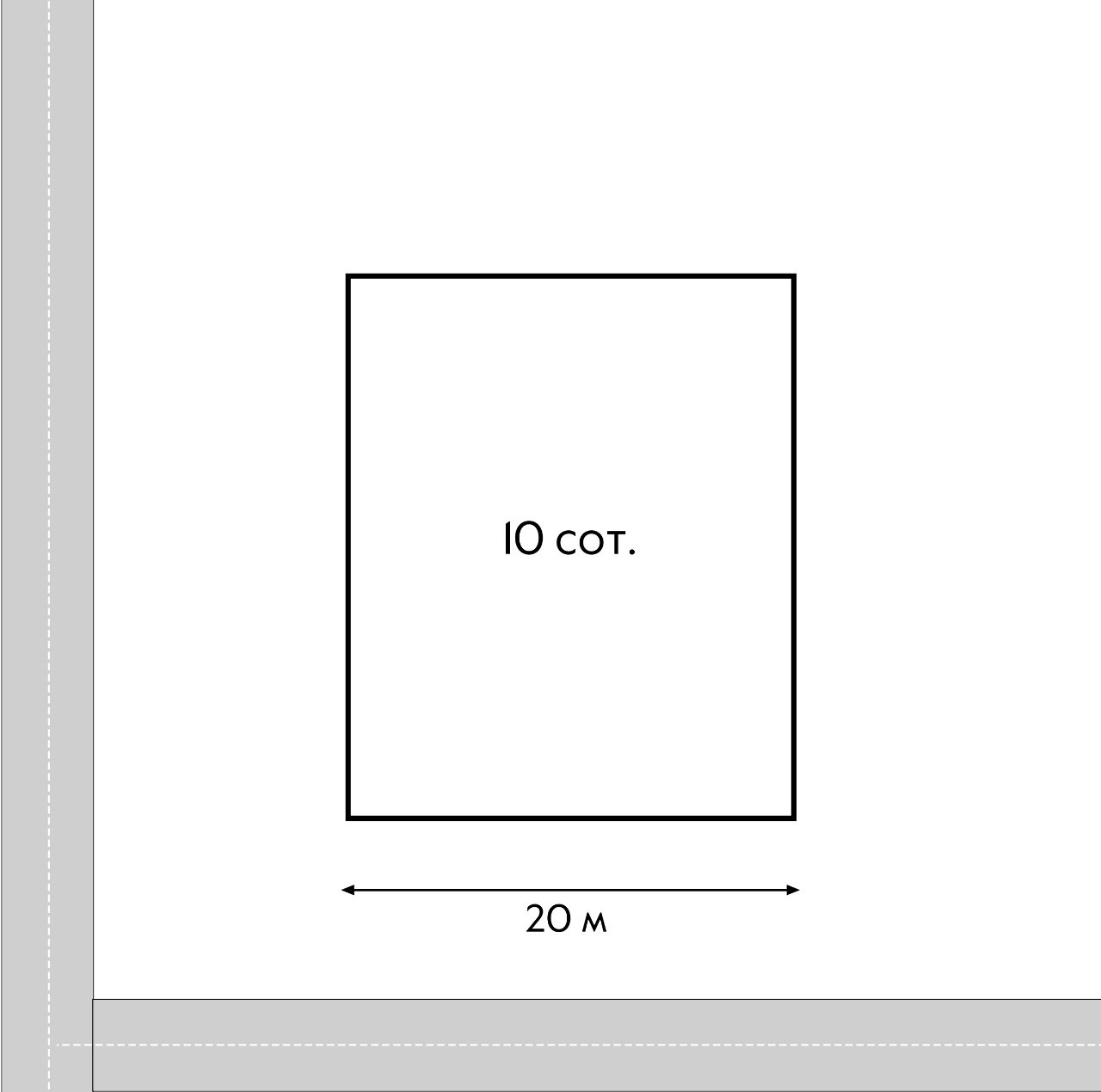 Участок прямоугольной формы, с фасадом 20м и глубиной 50м, размером 10 соток.