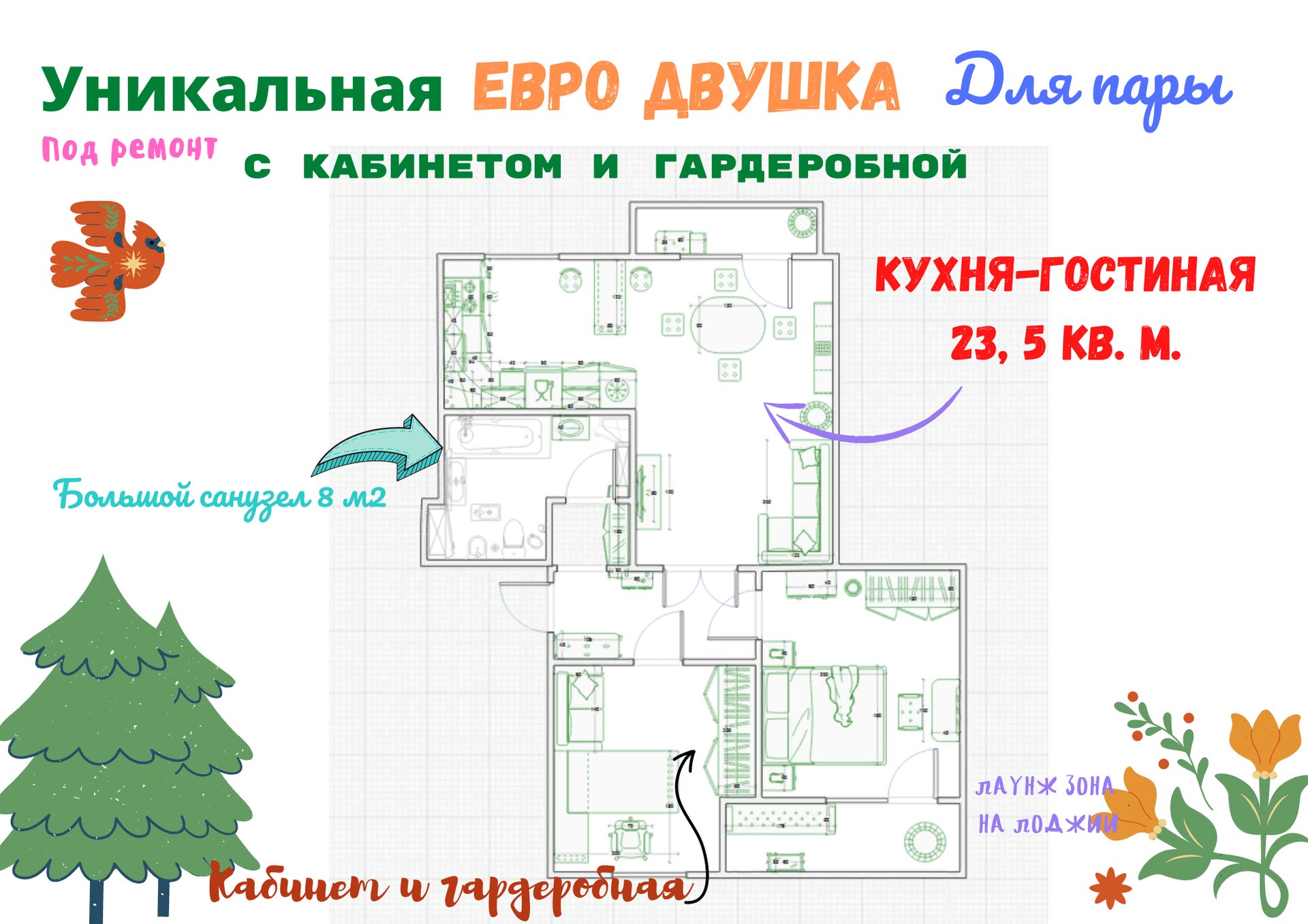 УНИКАЛЬНАЯ ЕВРО ДВУШКА ДЛЯ ПАРЫ, С КАБИНЕТОМ И ГАРДЕРОБНОЙ