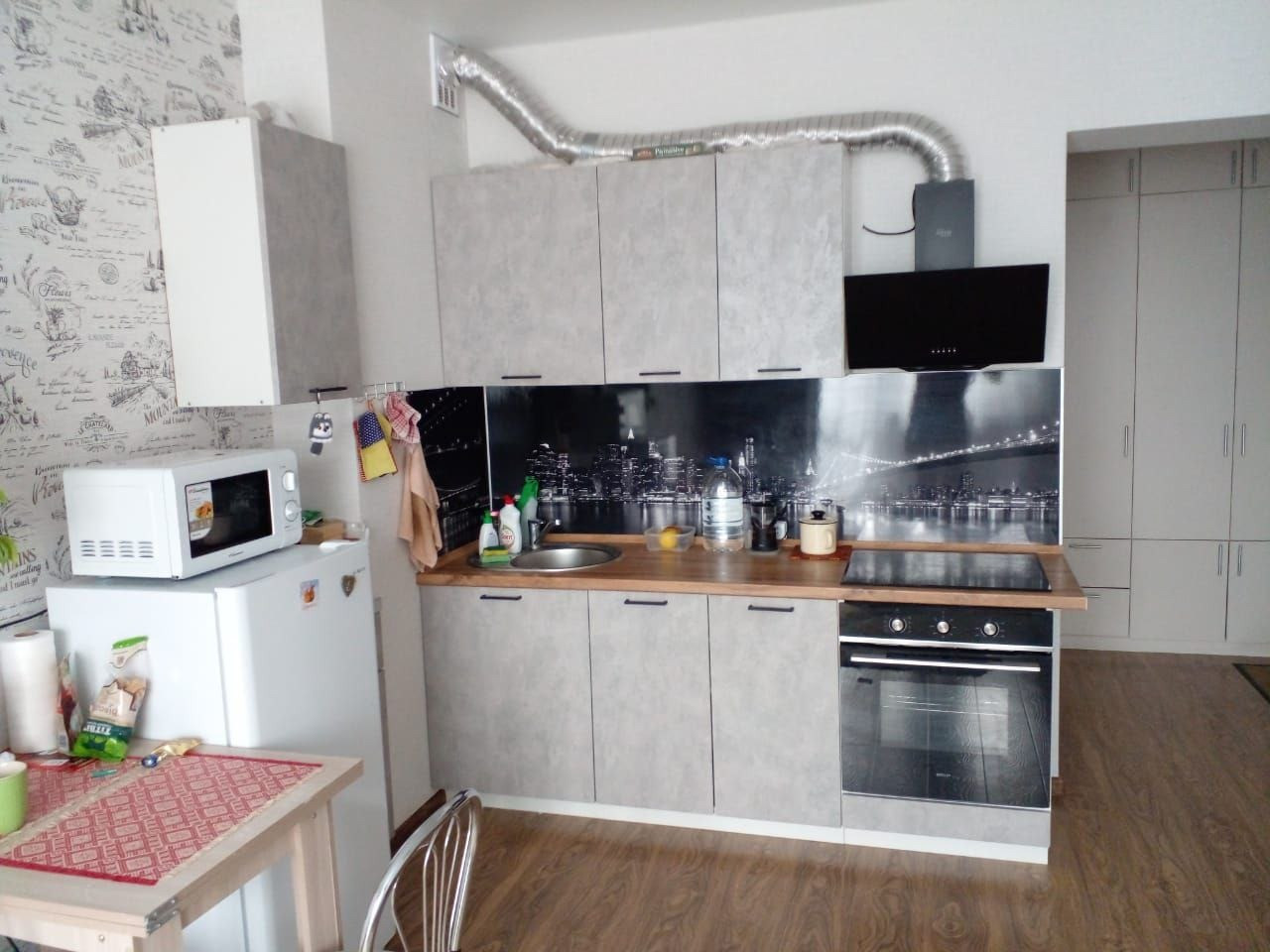Встроенный шкаф, кухонный гарнитур - остаётся. Балкон застеклен.