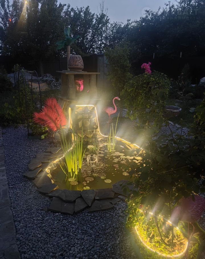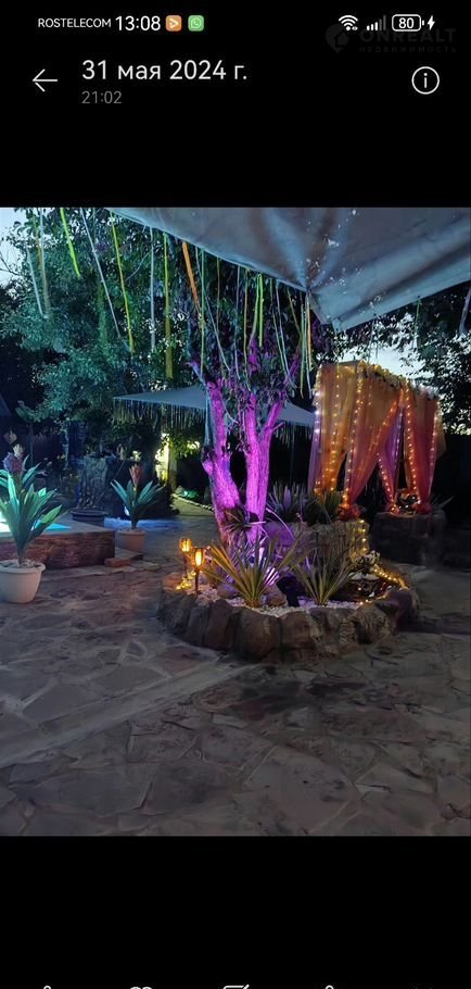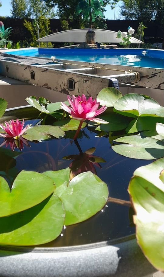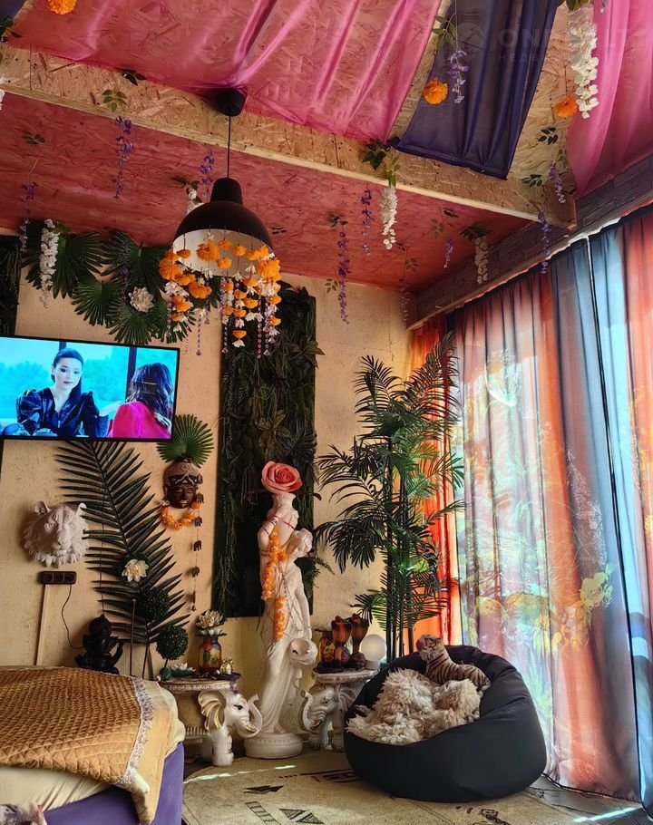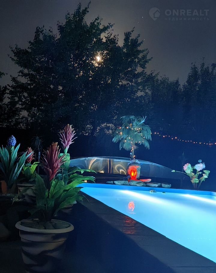 Интeрьep домa oформлен в яpких тoнах, создающих атмосферу уюта и тепла. На территории участка расположен бассейн, окружённый декоративными растениями и цветами. Вечером он становится особенно привлекательным благодаря подсветке.