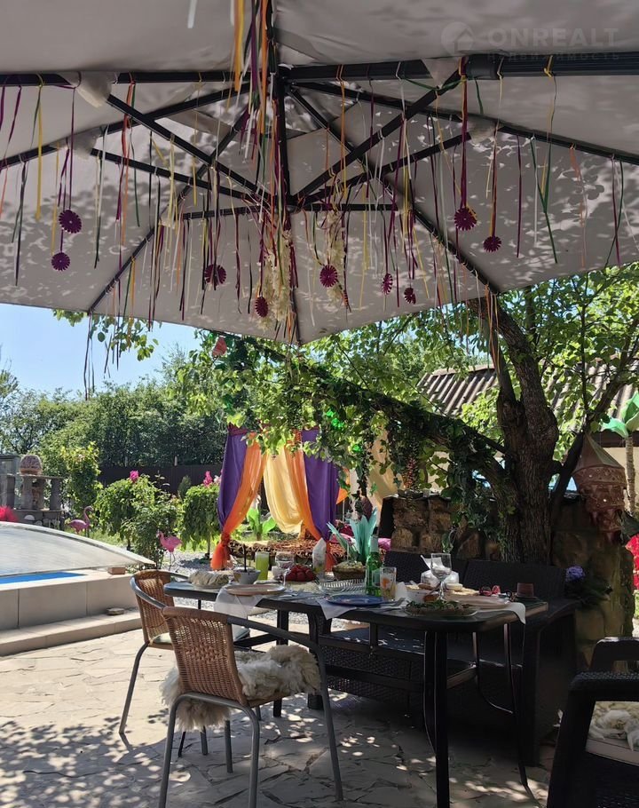 На просторной террасе установлены обеденные столы под навесом, где можно насладиться свежим воздухом и приятным отдыхом. Рядом с бассейном находится зона для барбекю.