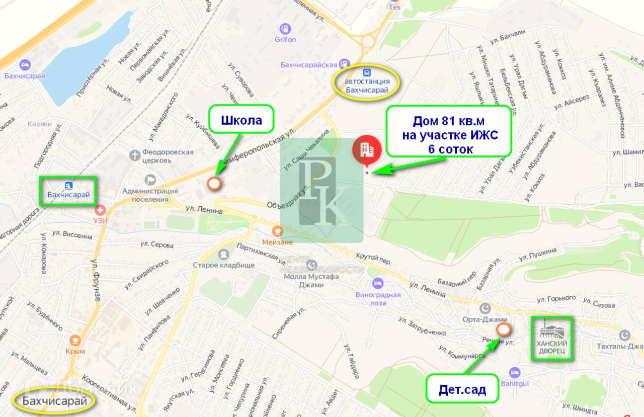 Дом 81 м2 на участке 6 соток, одноэтажный. Расположен в республике Крым, г. Бахчисарай, переулок Улаклы. Коммуникации: 15 кВт электричество, водоснабжение скважина.