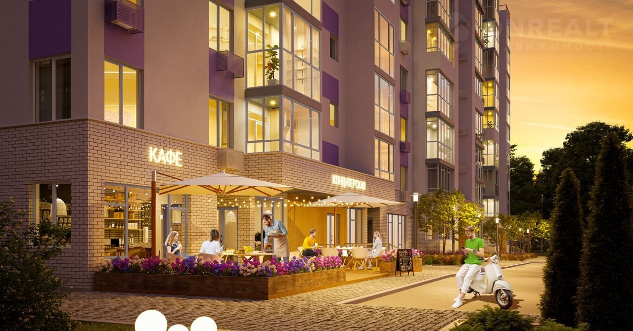 В одной из секций дома предусмотрены встроенные коммерческие помещения для размещения кофеен, продуктовых магазинов, аптек и других объектов торговли и услуг.