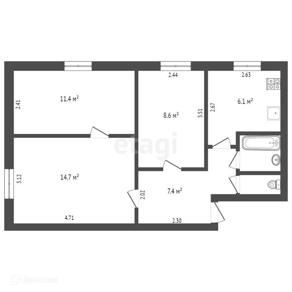 - площади комнат - 14,7/11,4/8,6 м2;