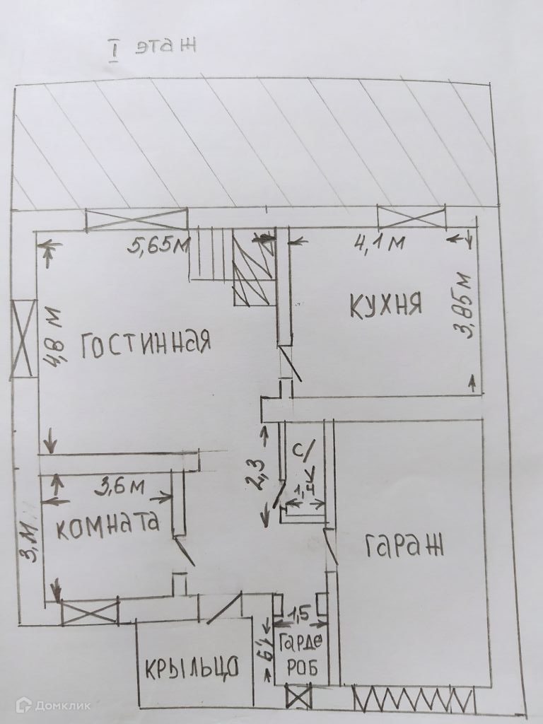 1 этаж предполагает: -прихожую около 3 м2 -гардеробную 2.85 м2 -одну комнату 11 м2 -вторую комнату гостиную 27 м2 (в ней предусмотрен камин) -кухню 16 м2 -сан.узел с душевой 3.22 м2.Так же на первом этаже имеется смежное с домом помещение гаража с входом в него из дома и закрытое французской сейфовой дверью и электрическими воротами, гараж имеет площадь 32.5 м2.Высота потолков первого этажа 2,75 метра.