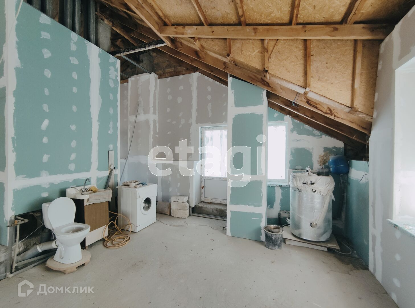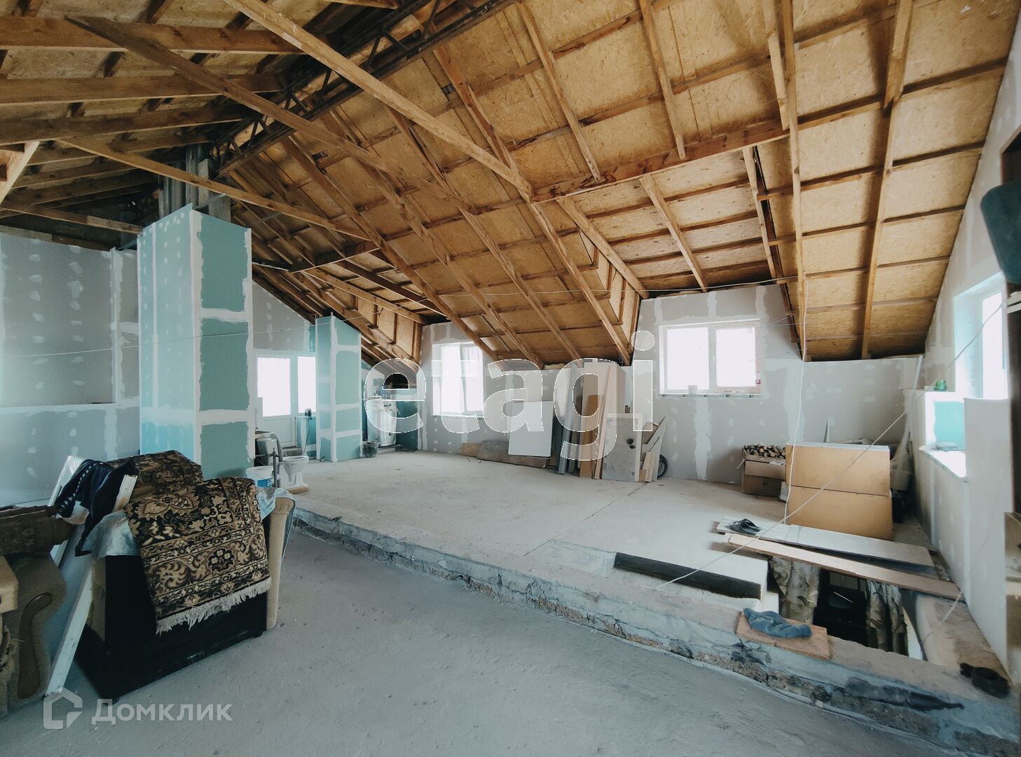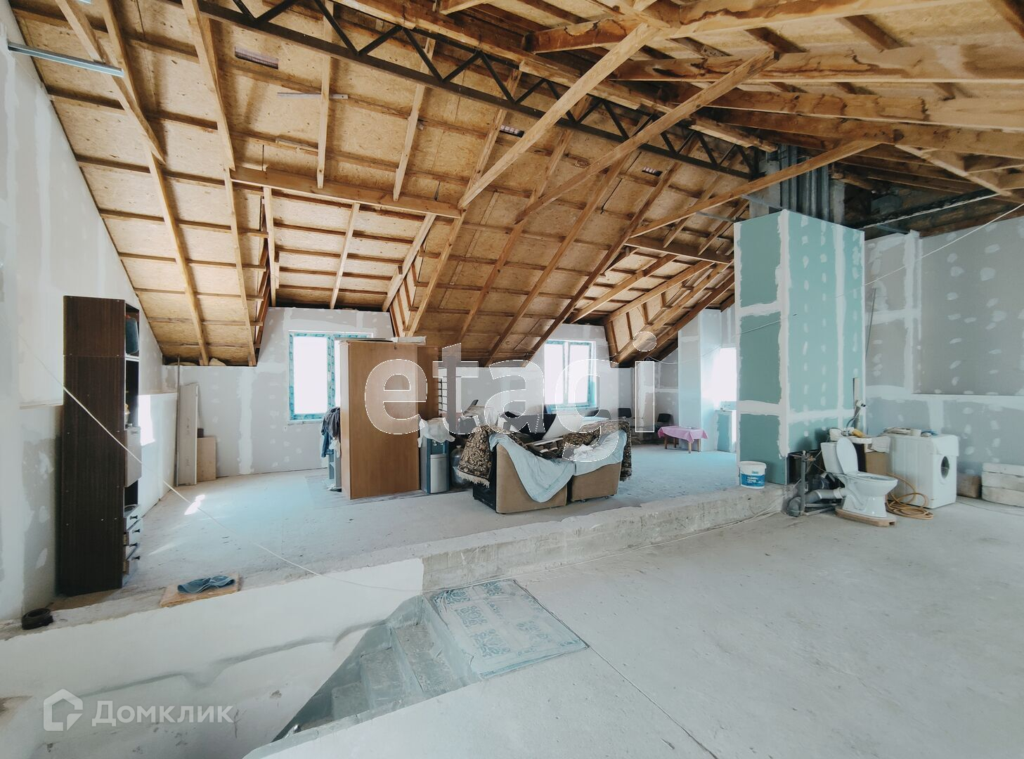 В квартире установлен двухконтурный газовый котел (АГВ). Второй масандровый этаж в процессе ремонта. Сейчас это помещение в 96 кв.м свободного назначения — можно зонировать как угодно, так как масандровый этаж остается по документам как нежилой.