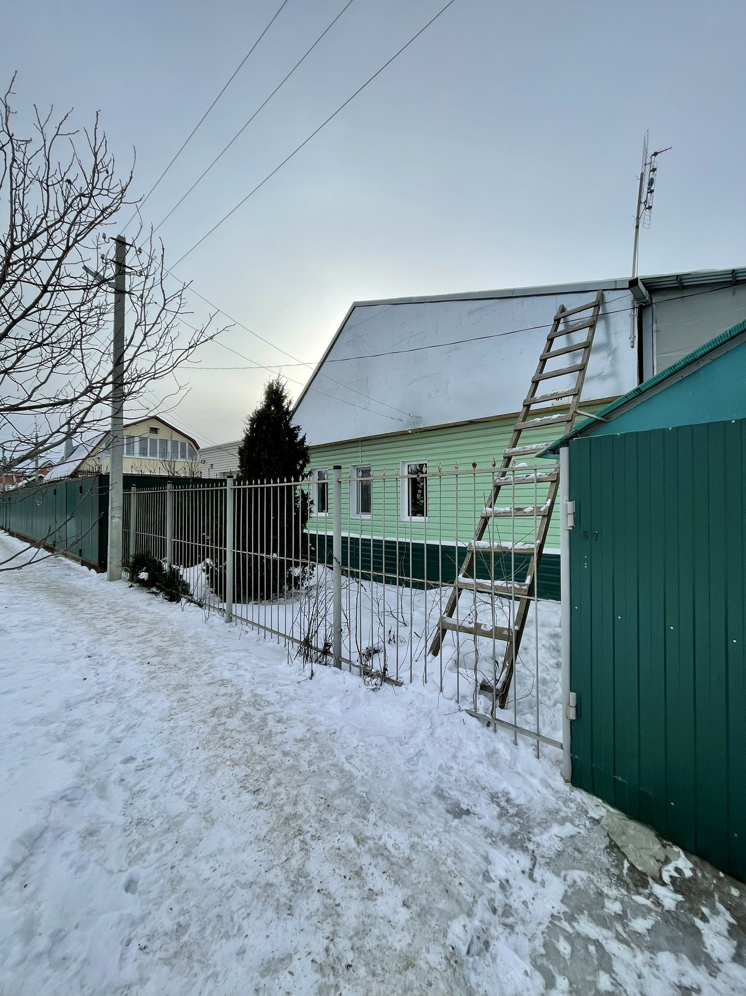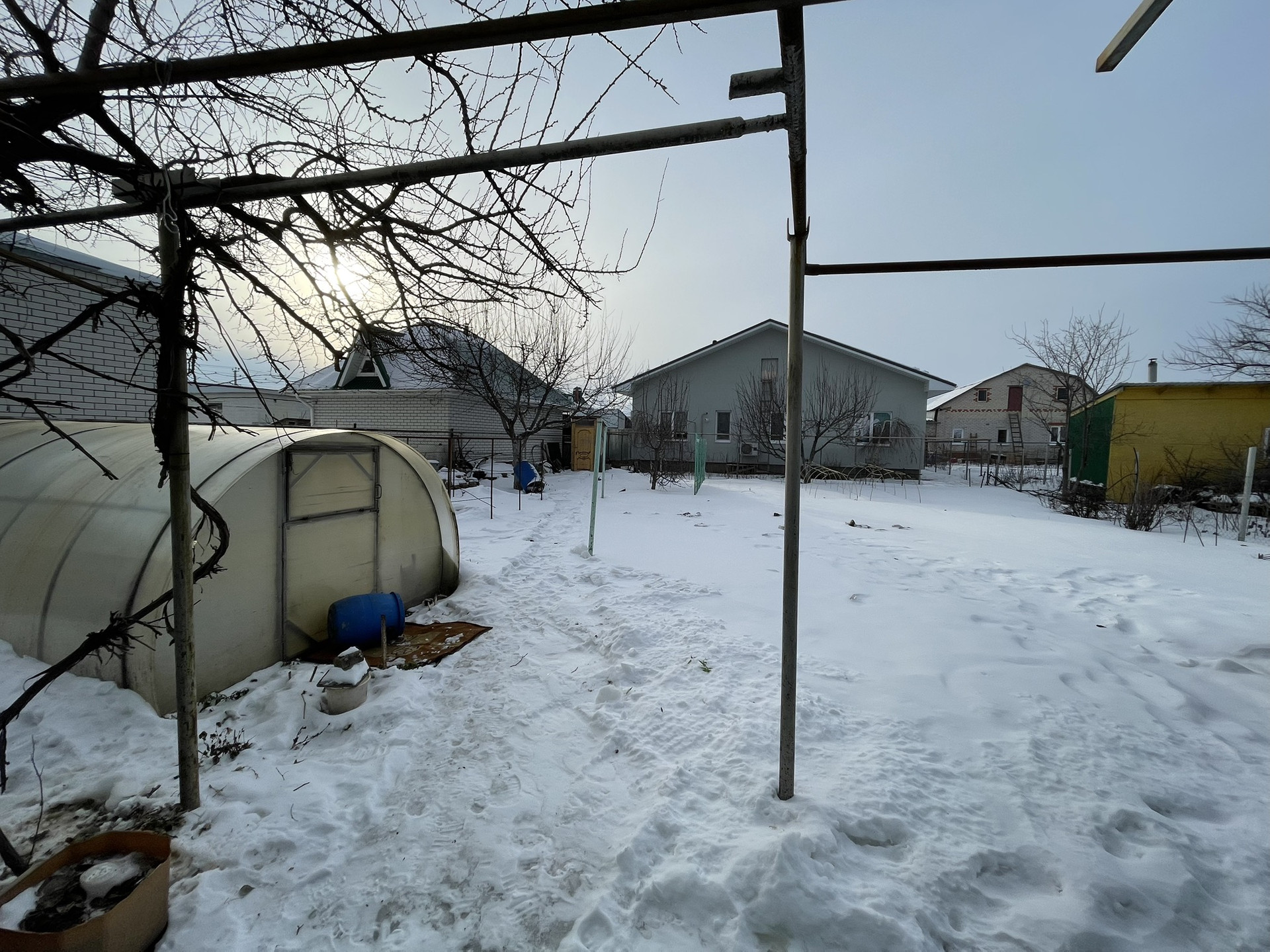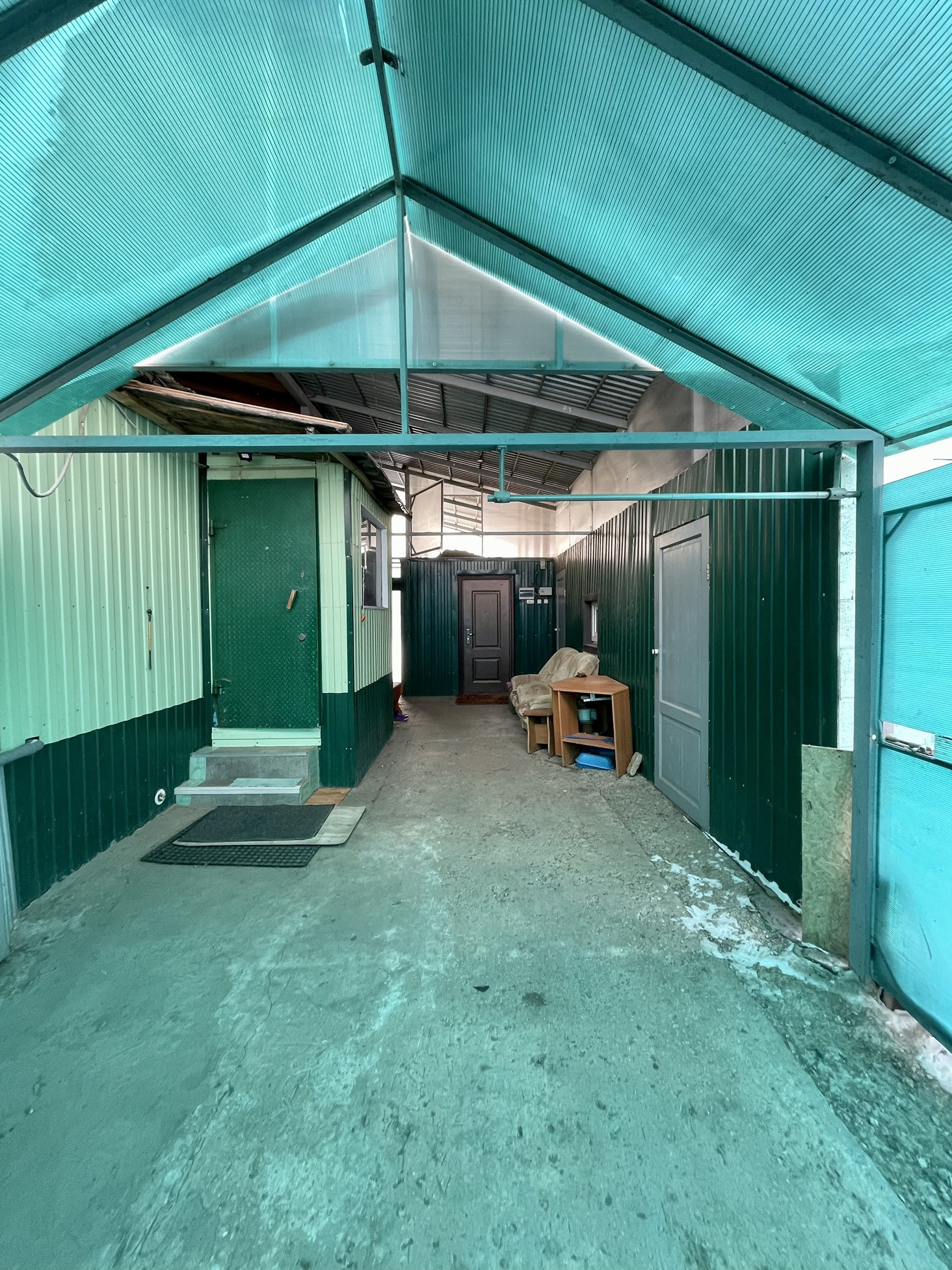 Двор по крышей , перекрыт поликарбонатом, что освобождает от чисти снега во дворе. Несколько хоз построек. Погреб.