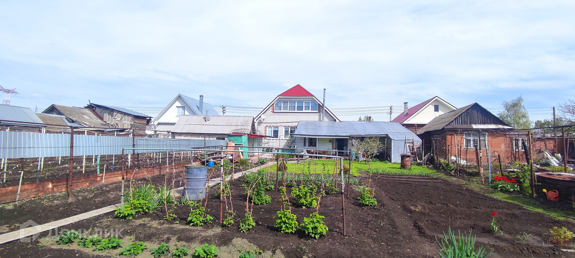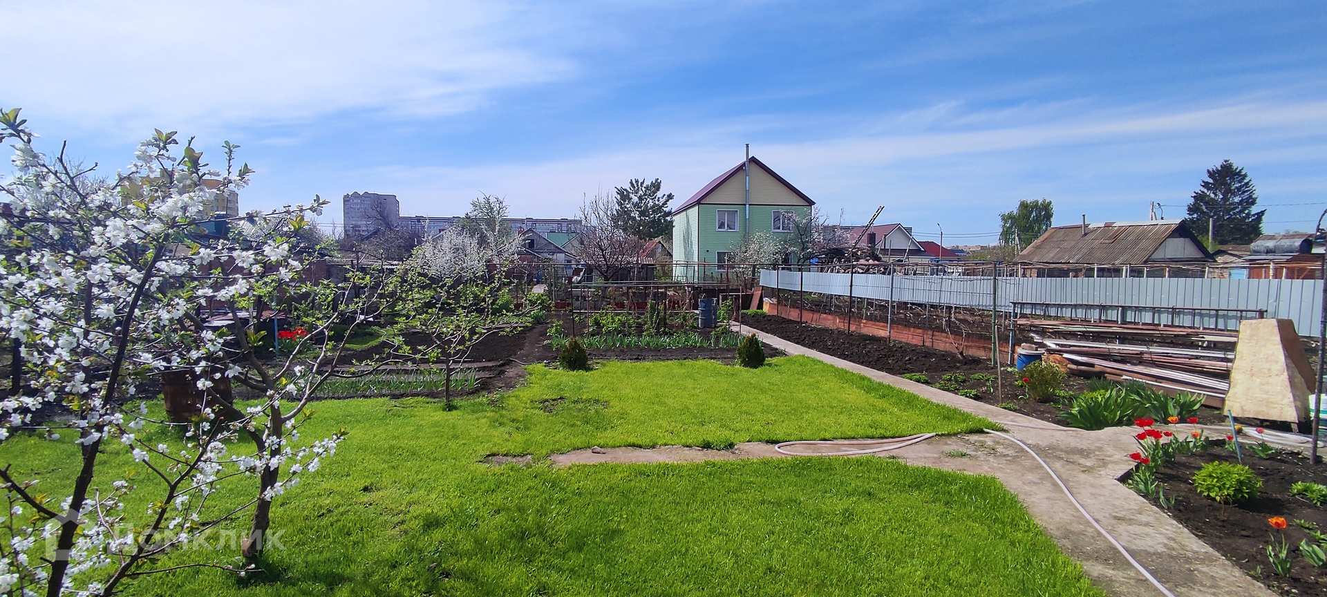 Большой, ровный участок с культурными насаждениями, всё ухожено, плодово-ягодные культуры, цветы и грядки для овощей! Также имеется палисадник перед домом! На участке имеется мастерская, летняя кухня с видом на участок, песочница для детей!