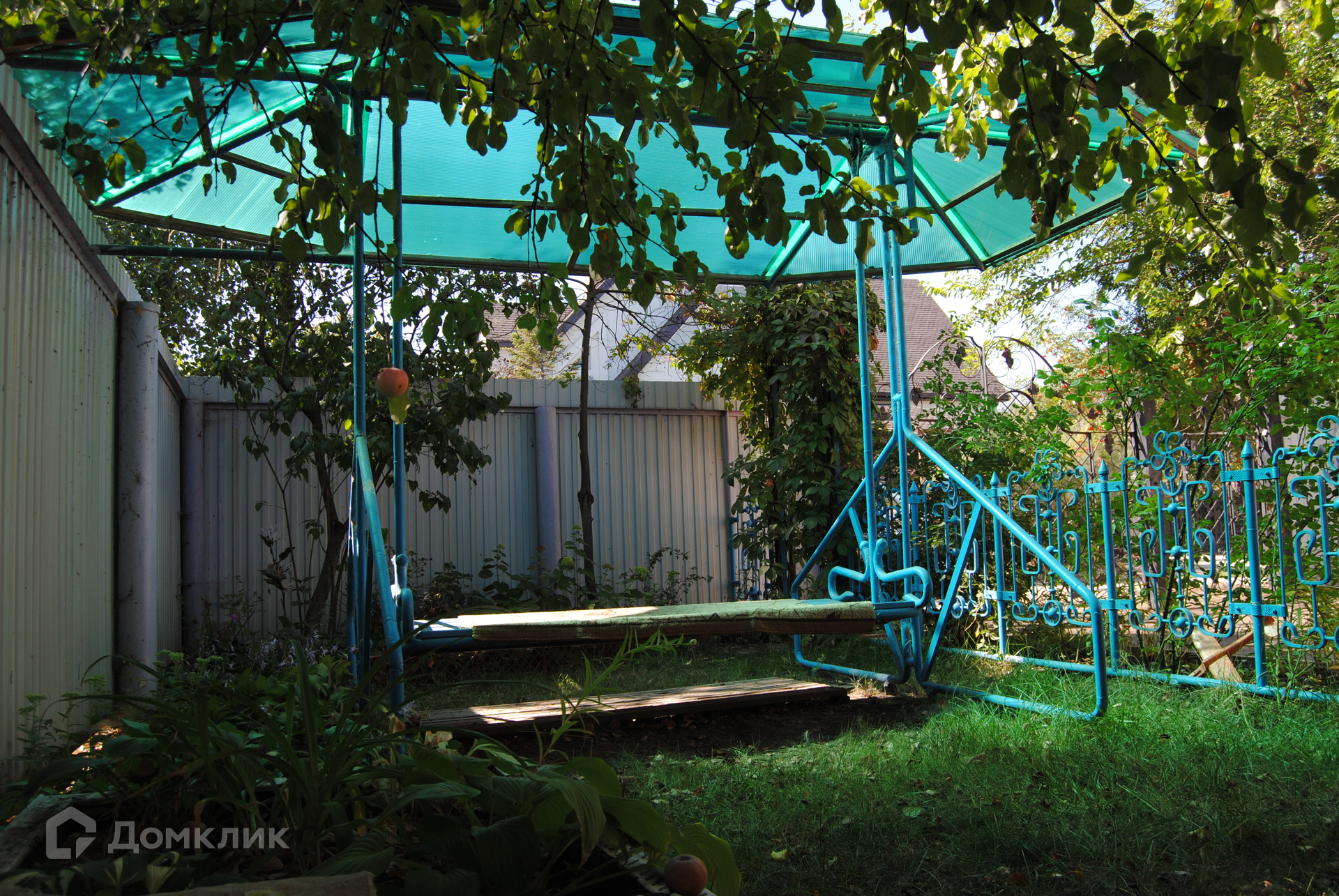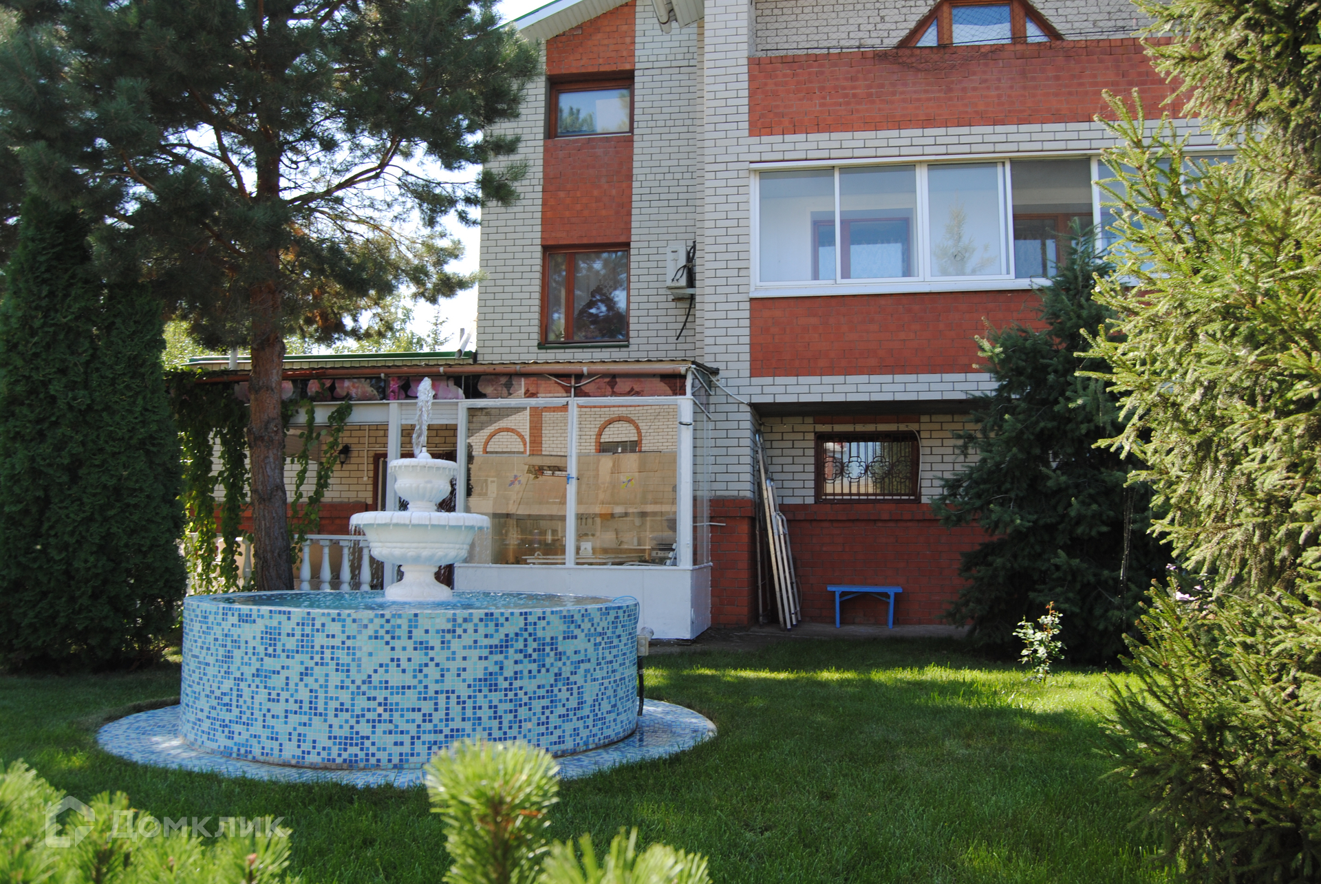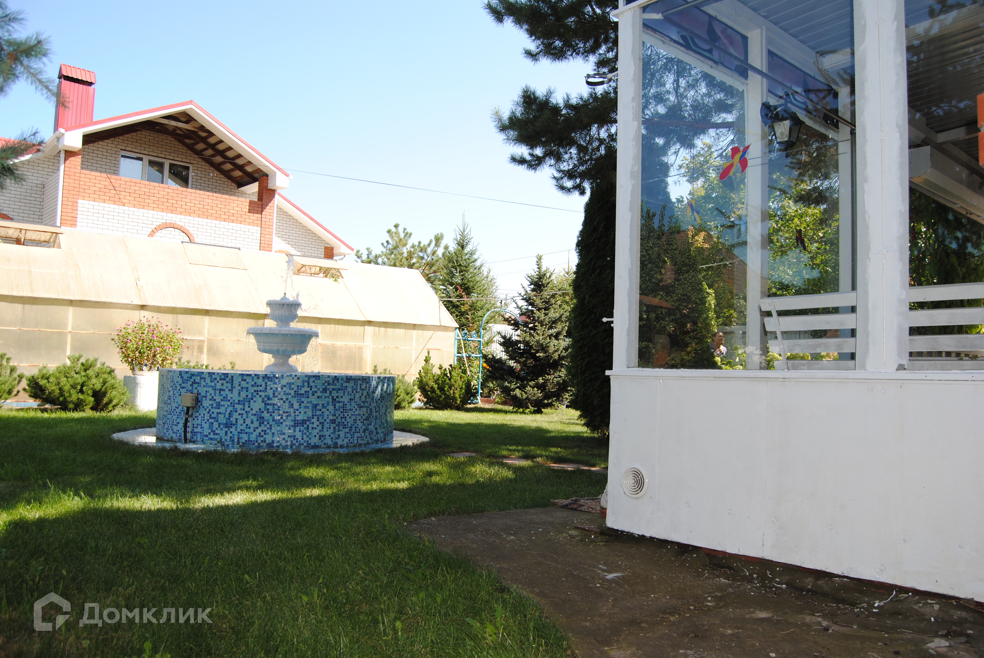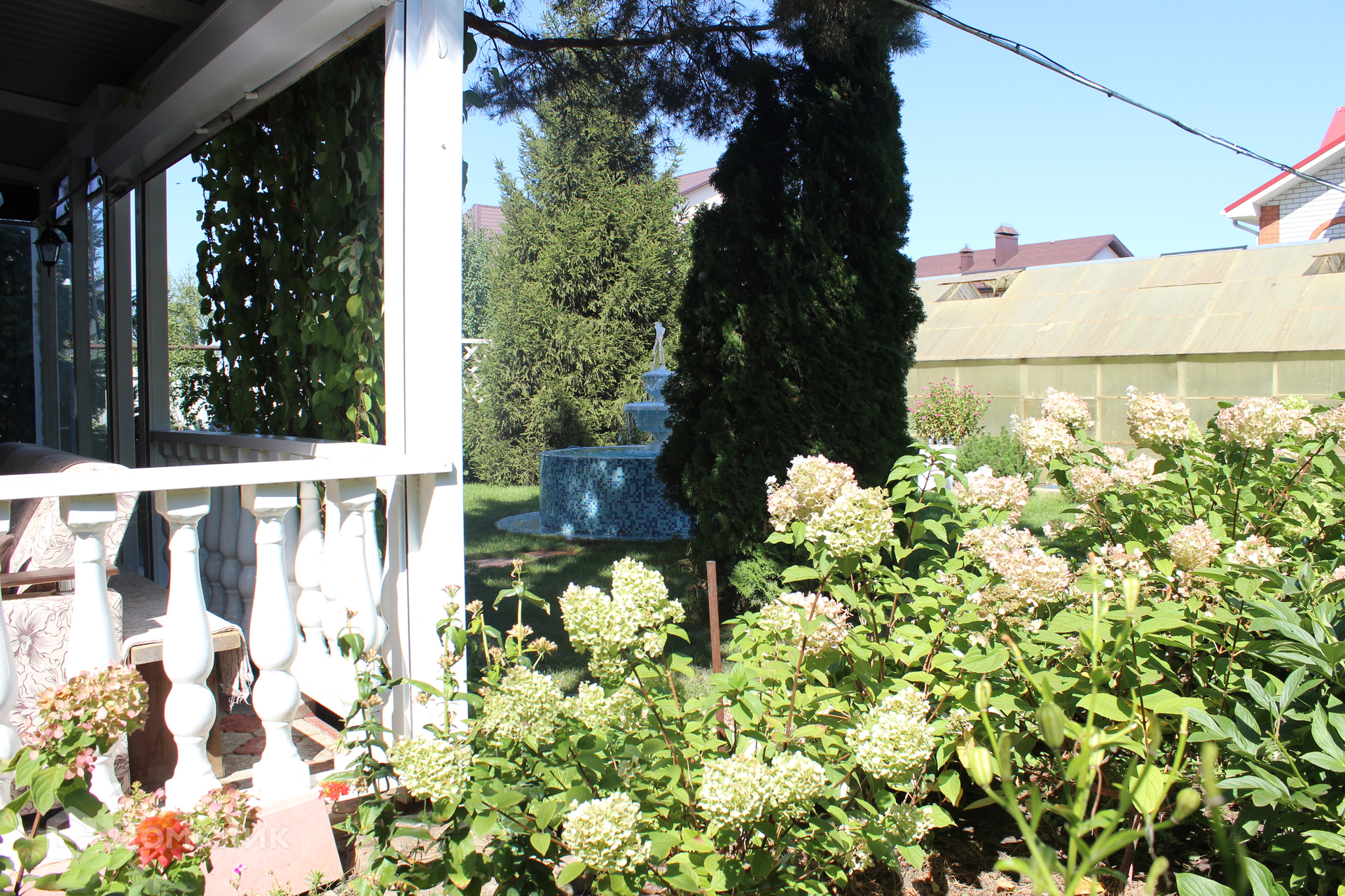 Во дворе: летняя кухня, фонтан, парковочная площадка, теплица, садовые насаждения.