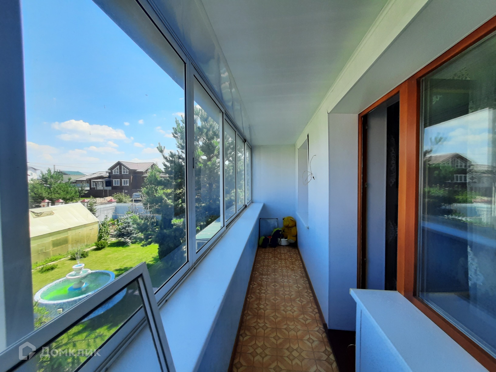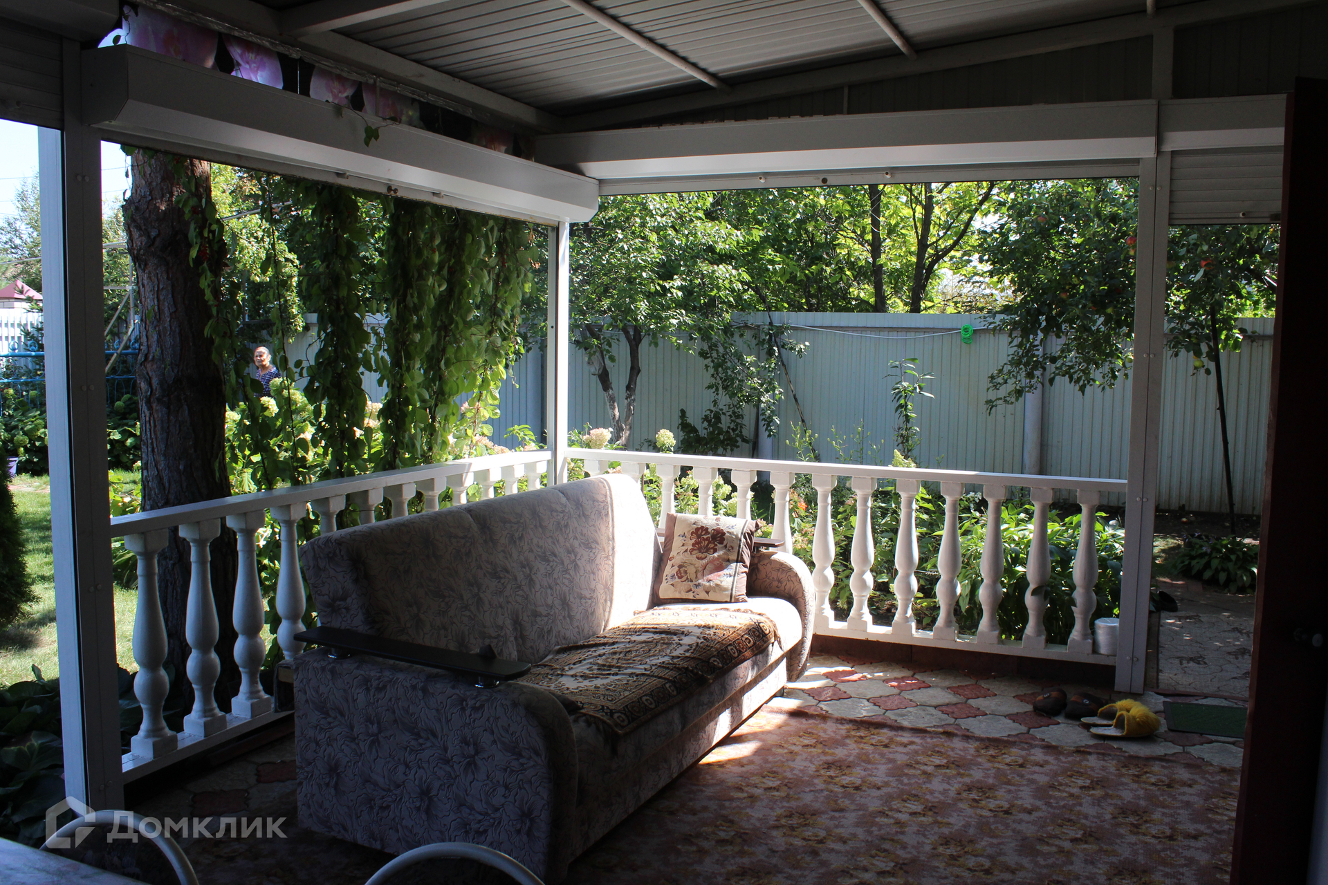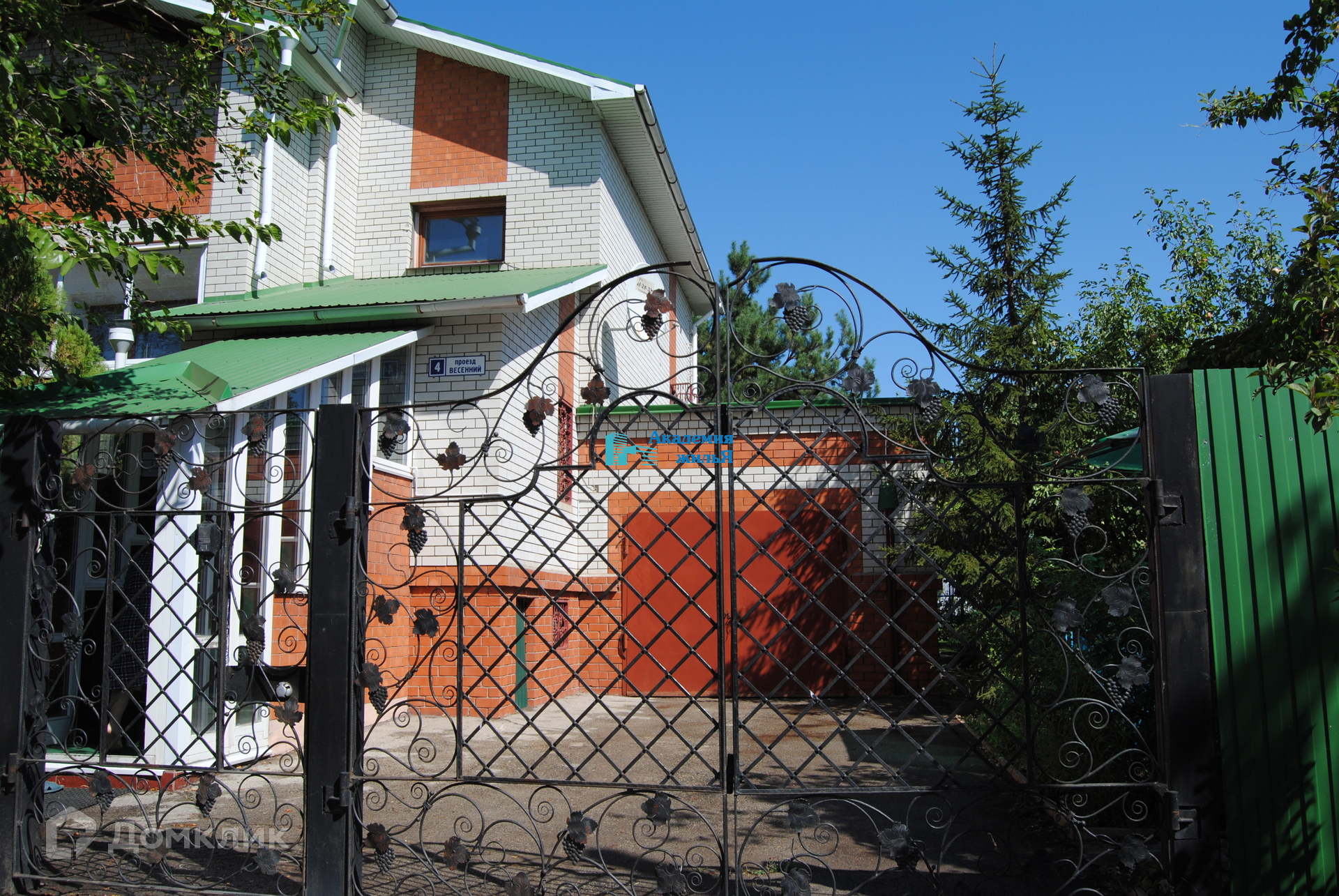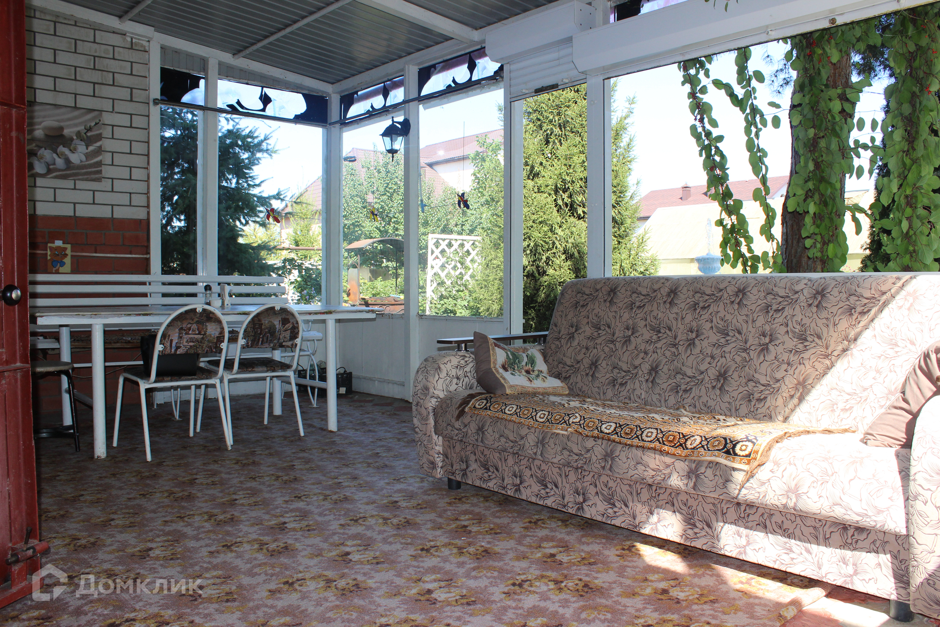 Во дворе: летняя кухня, фонтан, парковочная площадка, теплица, садовые насаждения.