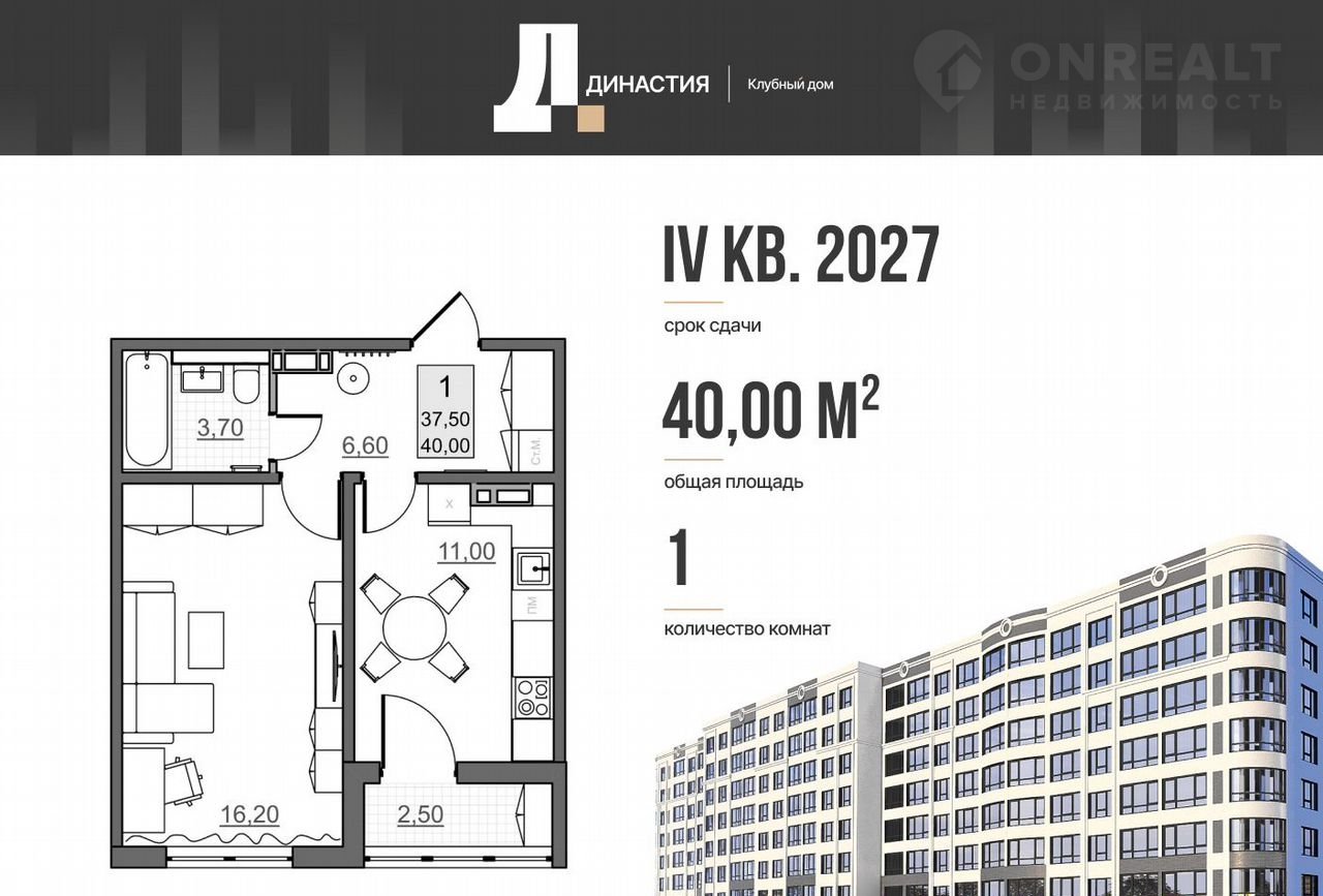Общая площадь 37.5 м2