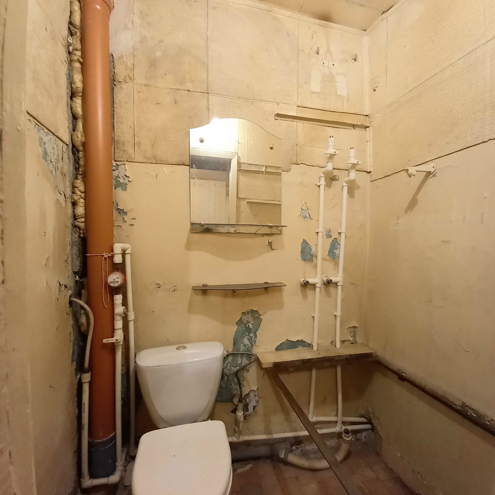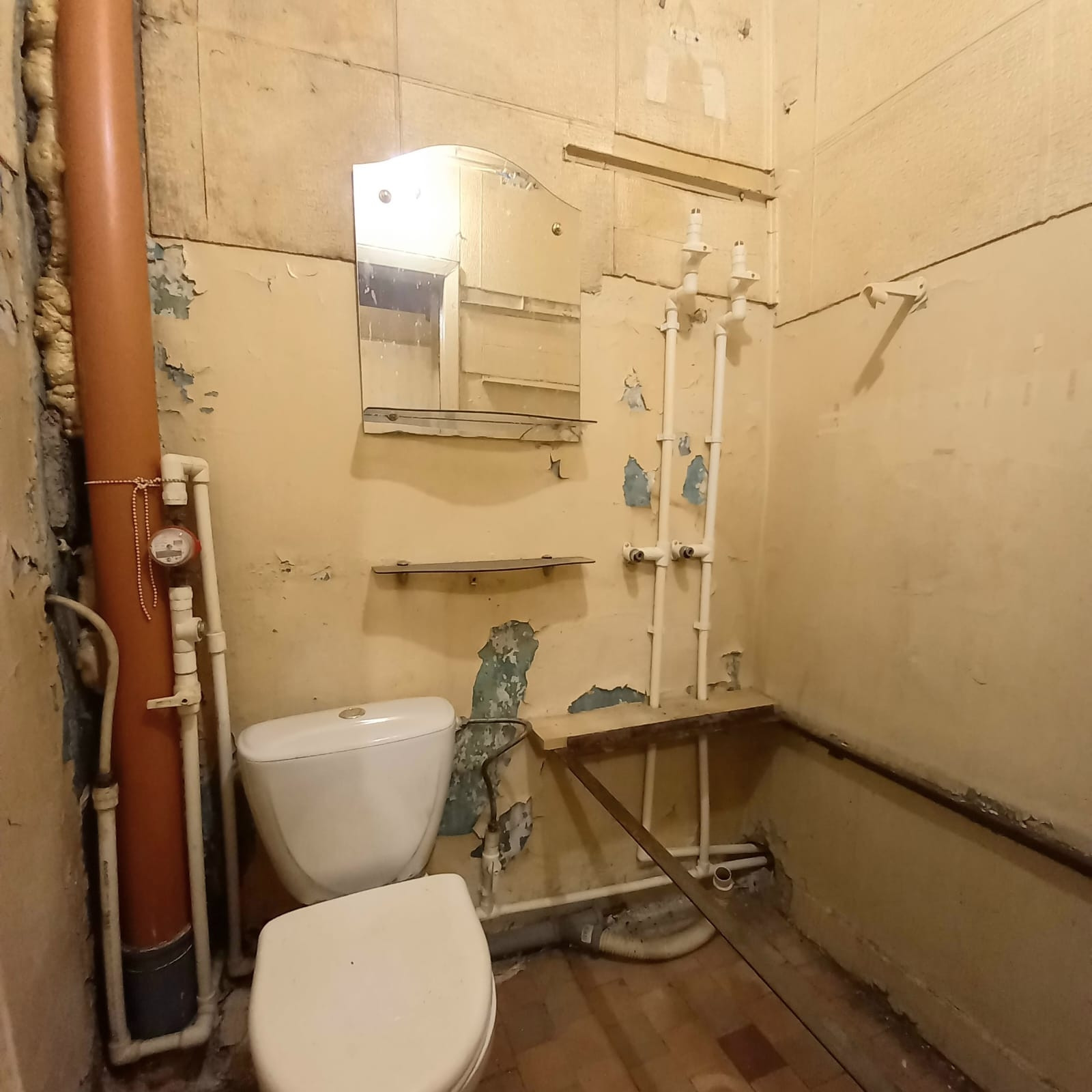 Квартира требует ремонта,  который вы можете сделать на свой вкус и по своему желанию! Трубы поменяны, включая канализационную, выведены трубы под водонагреватель, раковину, слив под каковину и стиральную машинку. Стоят счётчики.
