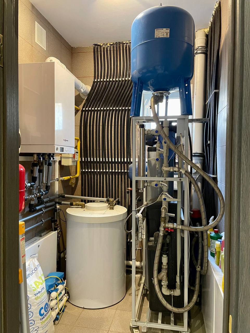 Отопление, ГВС, ХВС и теплый пол выполнены на основе систем Rehau (сшитый полиэтилен), имеются сертификаты и свидетельство о проведении испытаний и опрессовки. ГВС выполнена с циркуляцией горячей воды (трехпроводная подводка), в душевых установлены термостатические смесители Grohe.