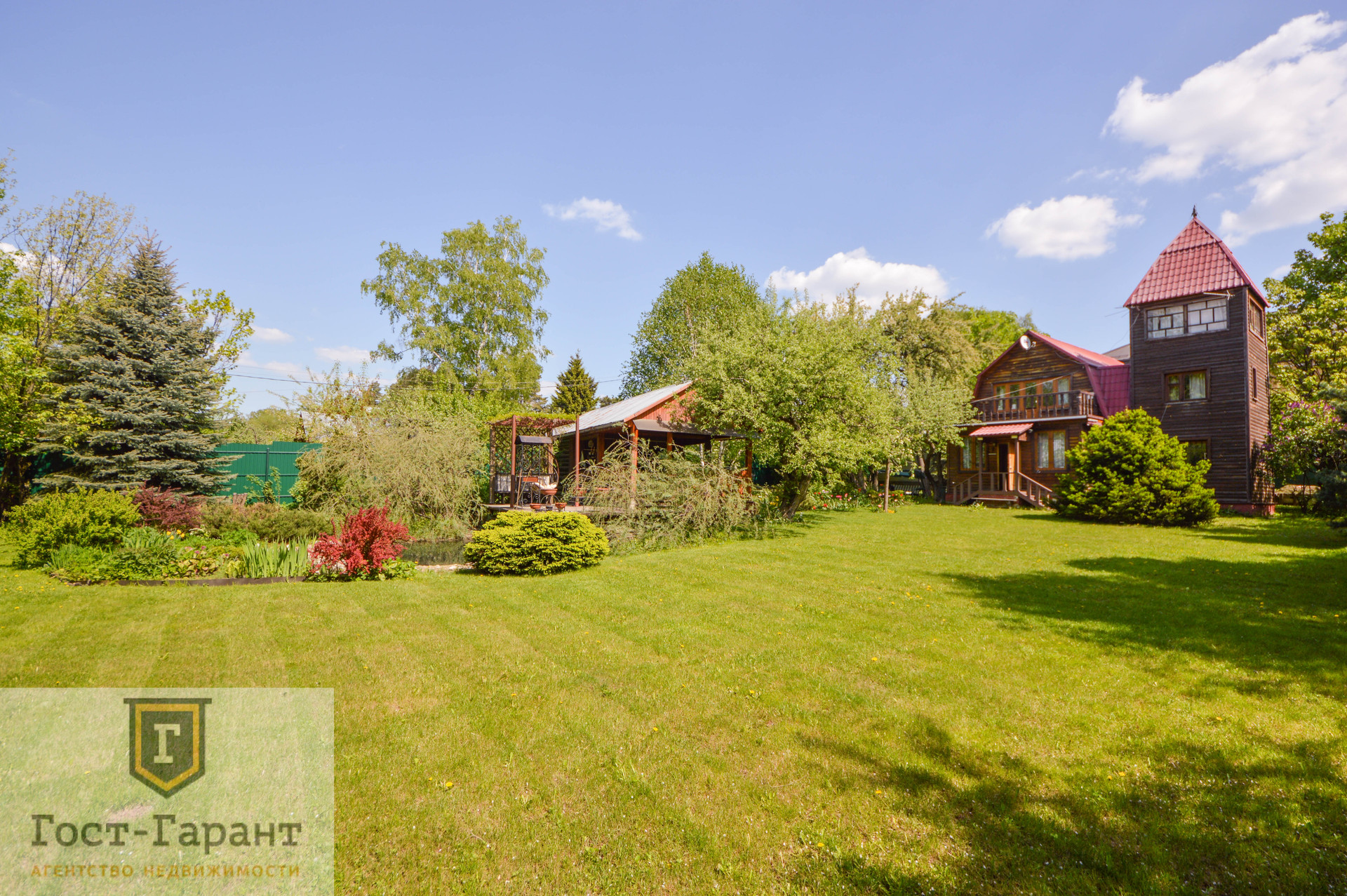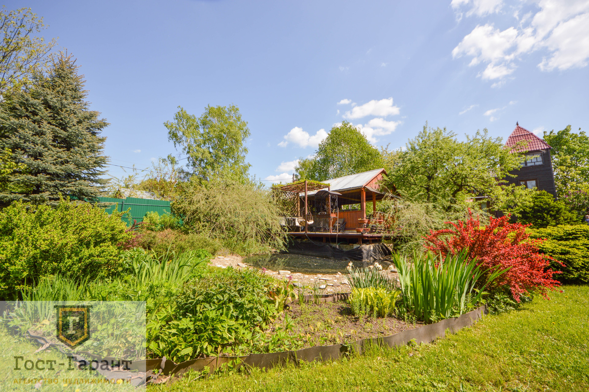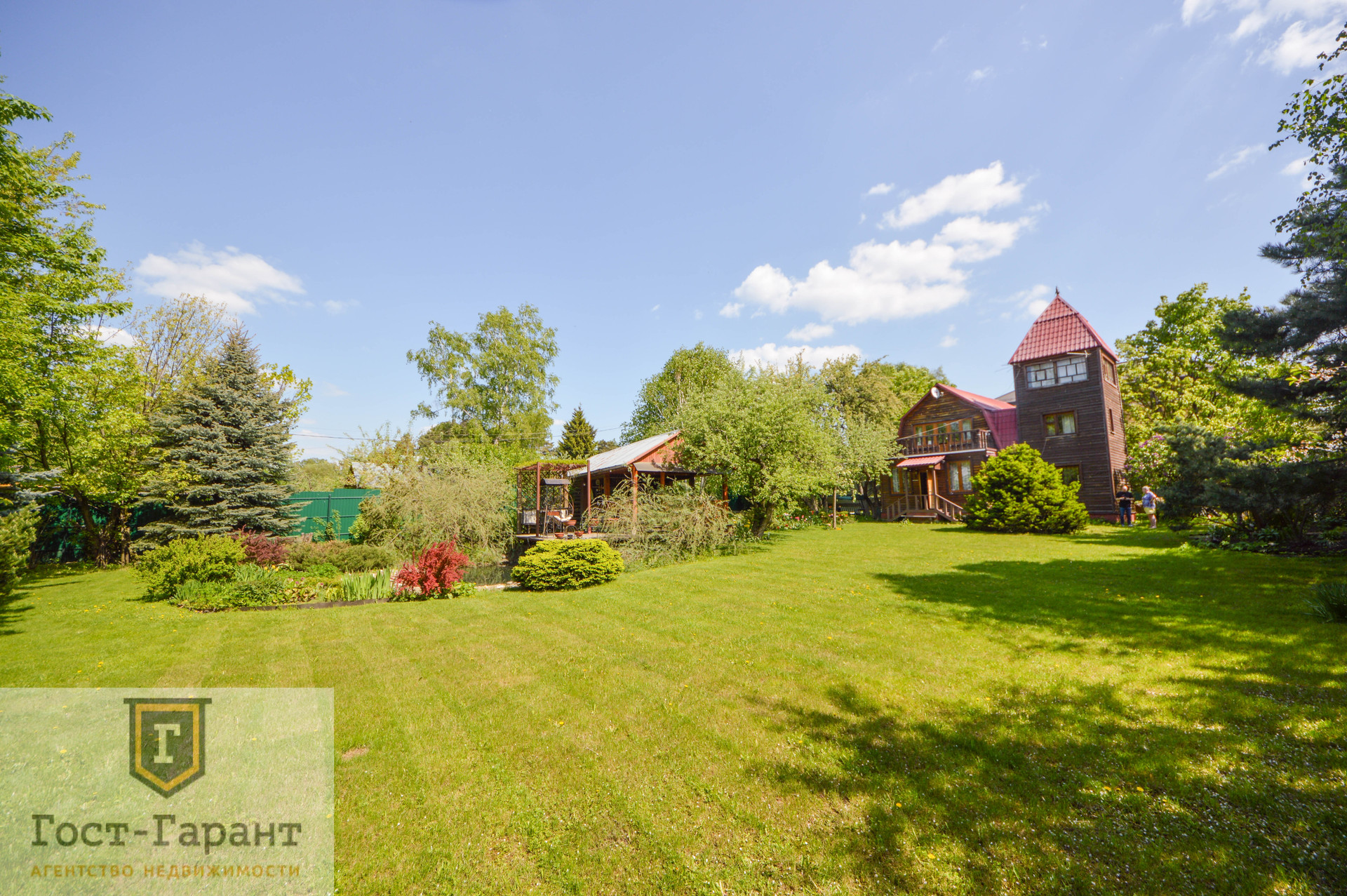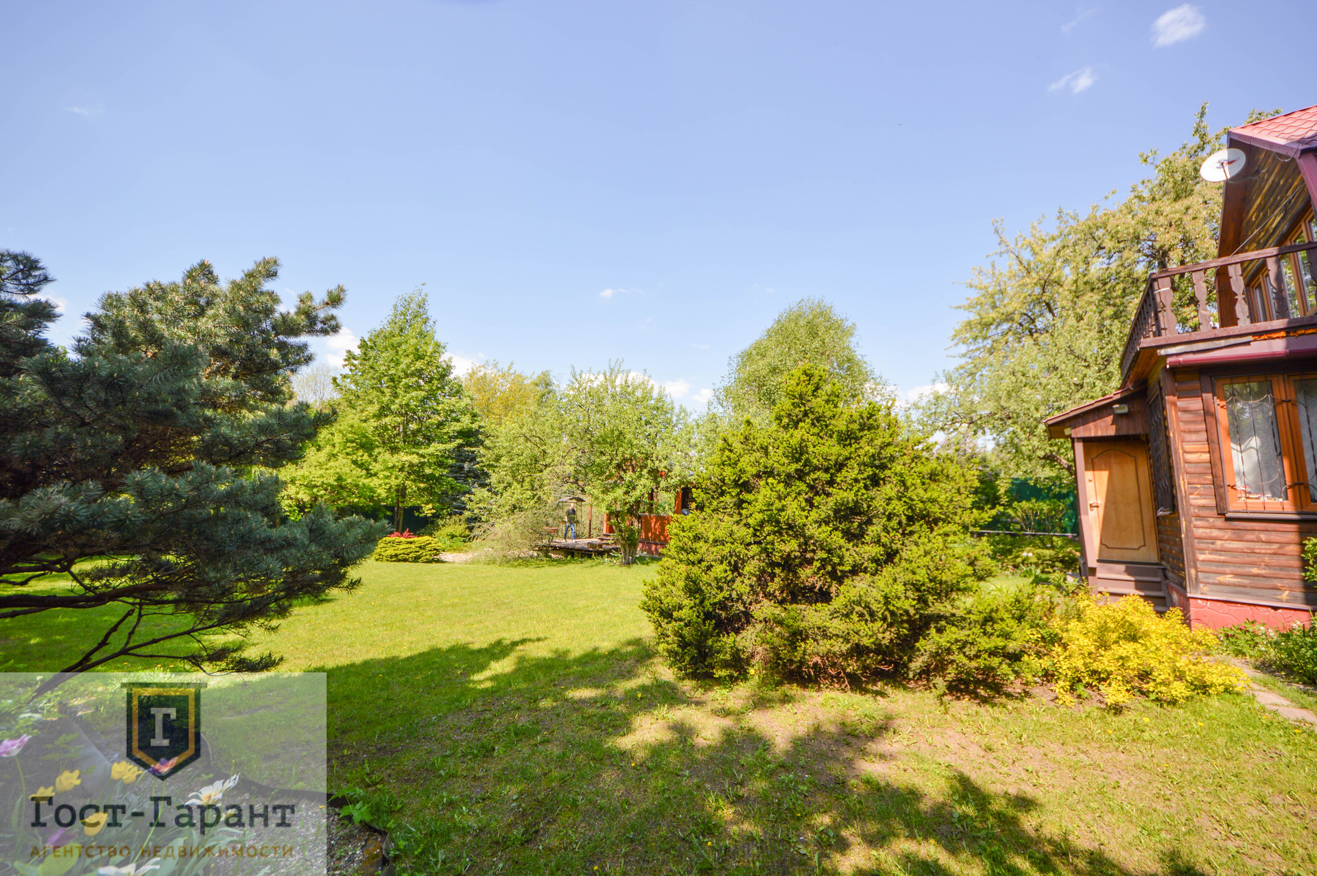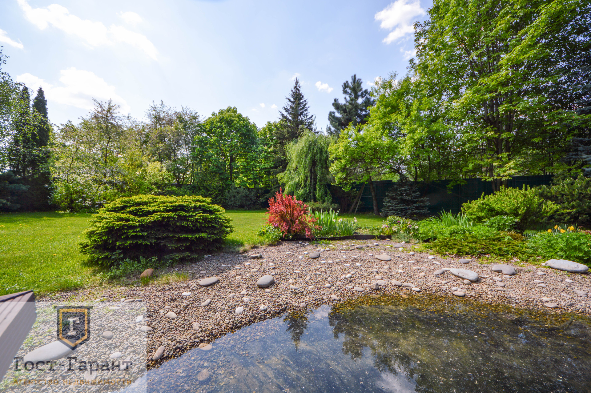 На ухоженном участке с ландшафтным дизайном просторный газон, по периметру высажены большие деревья (канадские сосны, голубые ели, каштаны, различные виды кленов и др.), разбиты клумбы с цветущими многолетниками, небольшой декоративный пруд. Есть плодоносящий сад (яблоки, вишни, черешни, малина, смородина, крыжовник и пр.), а также гараж, сарай и баня с большой верандой и зоной отдыха у пруда.