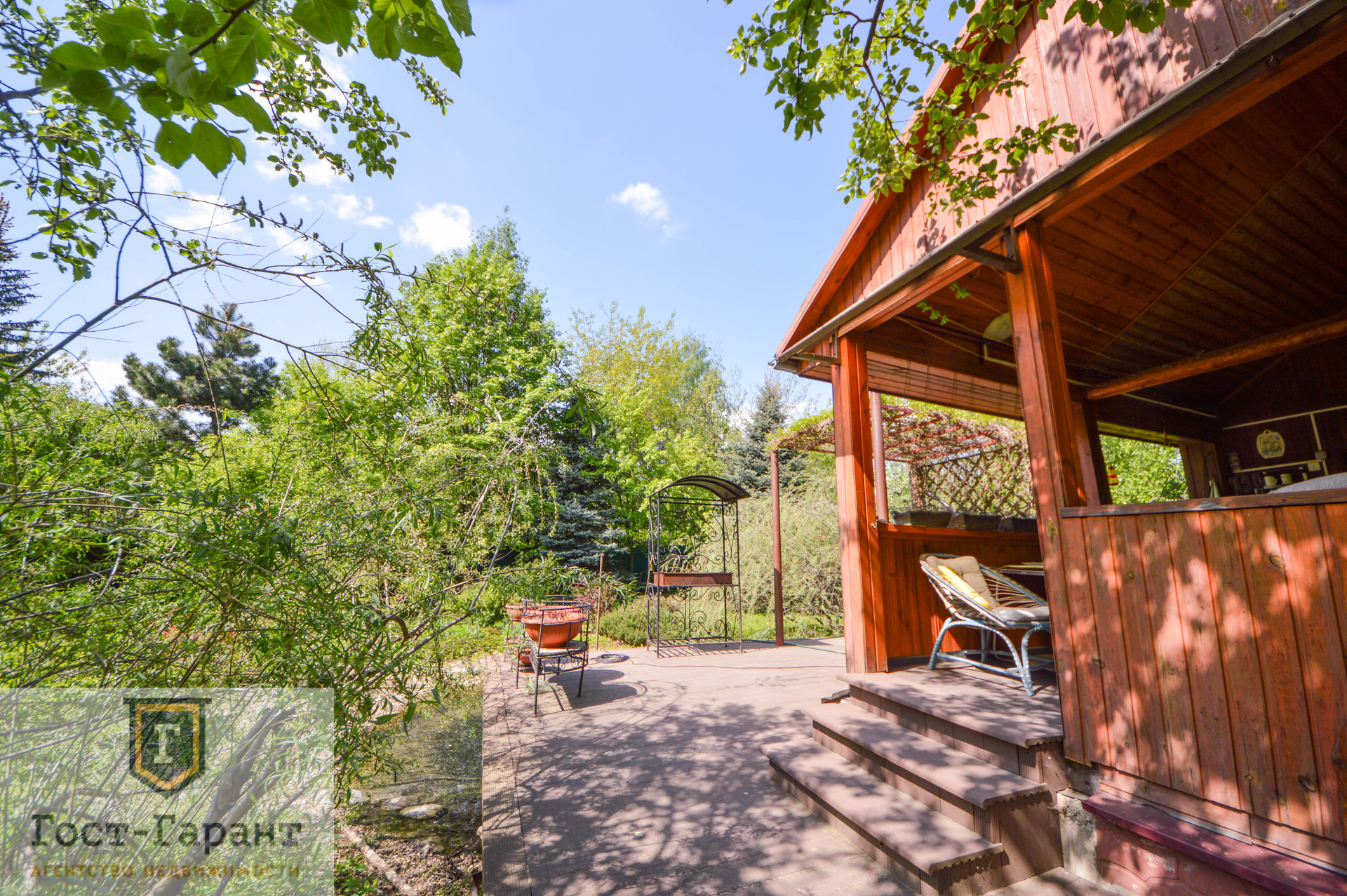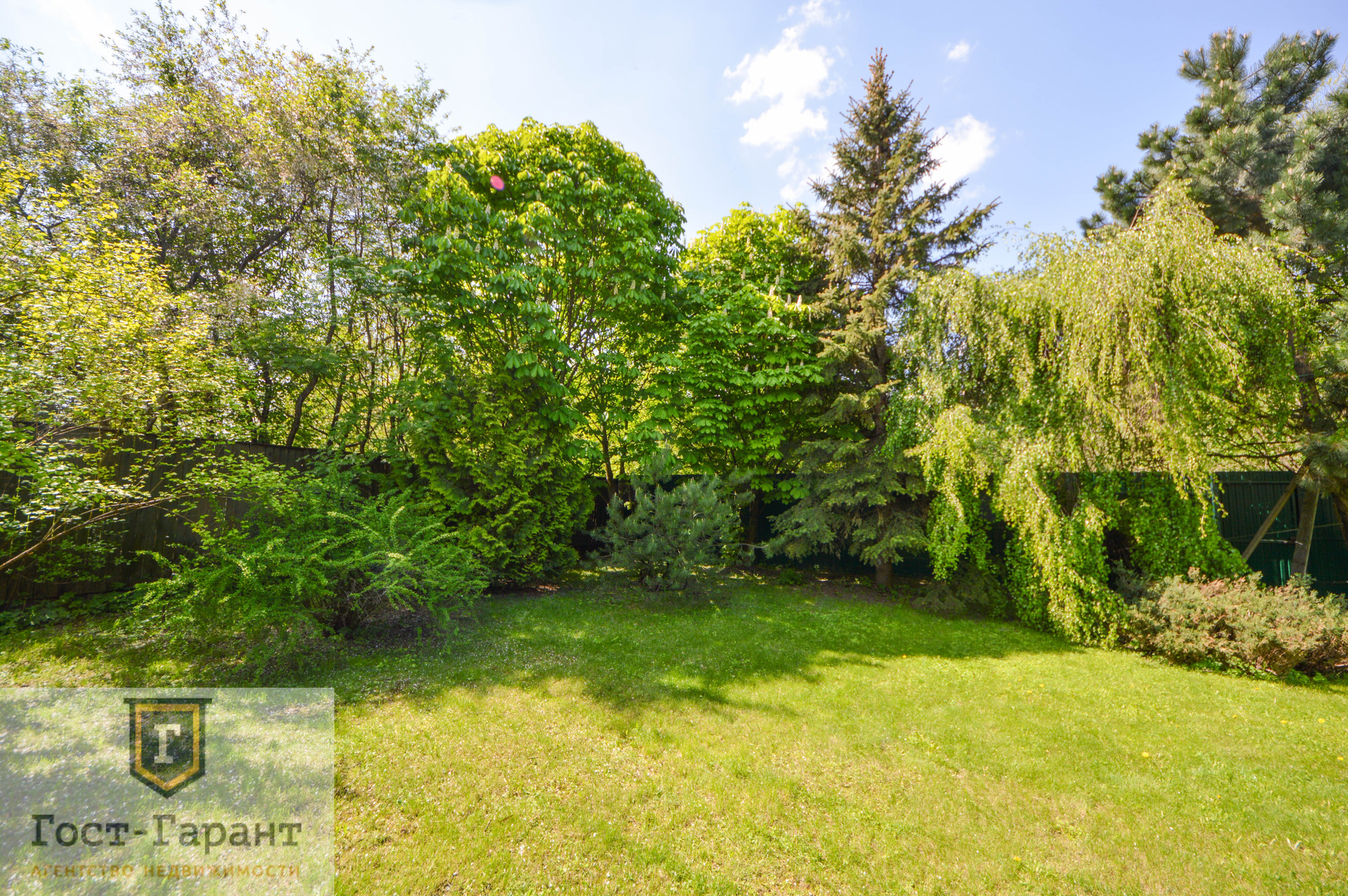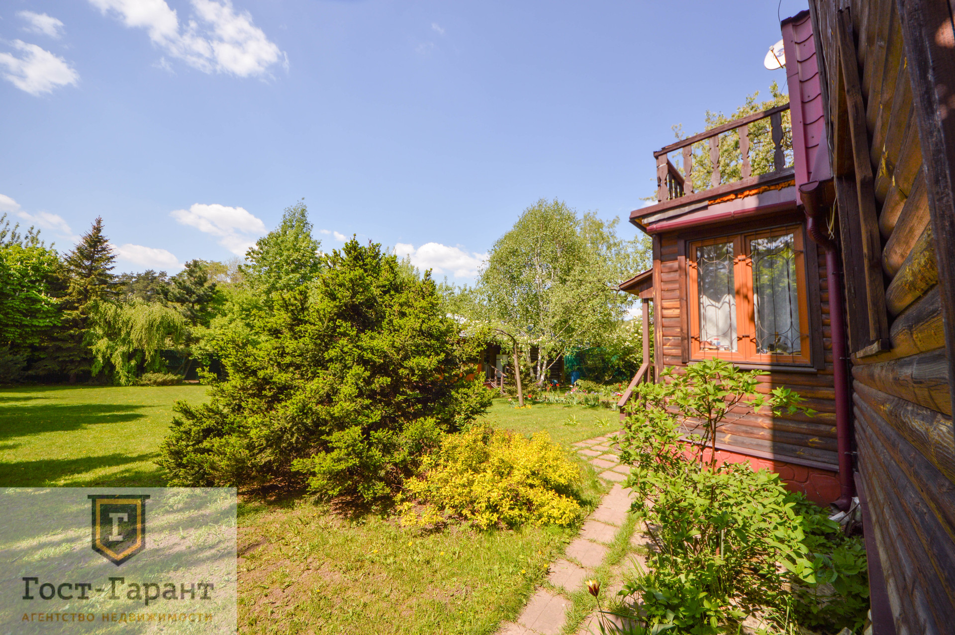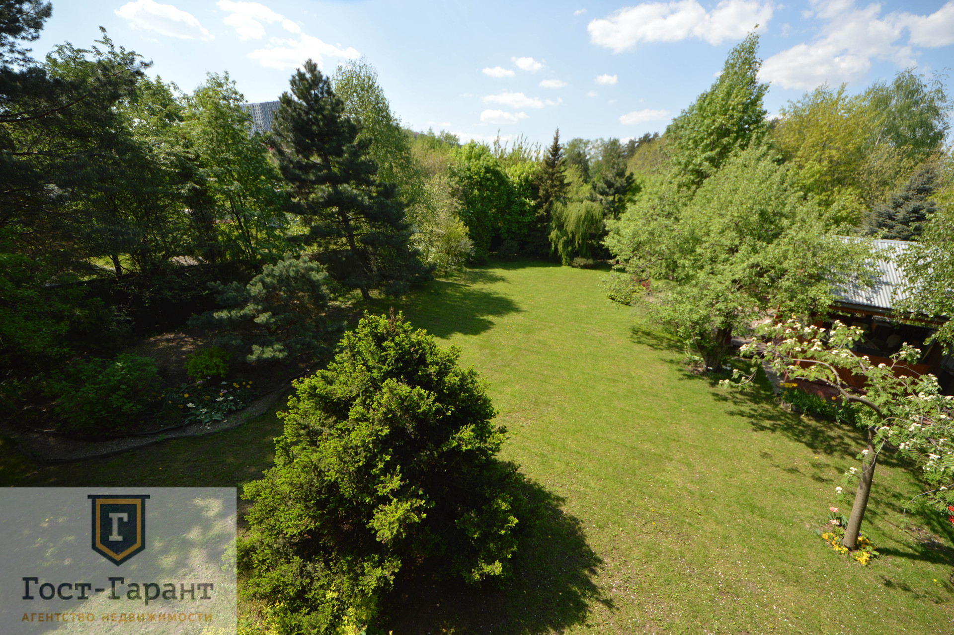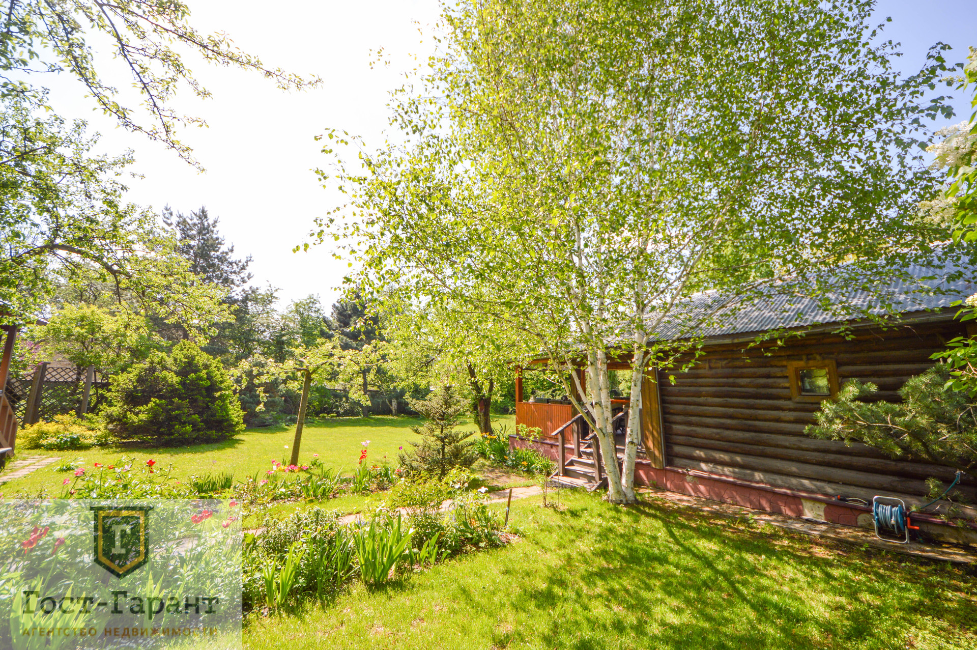 На ухоженном участке с ландшафтным дизайном просторный газон, по периметру высажены большие деревья (канадские сосны, голубые ели, каштаны, различные виды кленов и др.), разбиты клумбы с цветущими многолетниками, небольшой декоративный пруд. Есть плодоносящий сад (яблоки, вишни, черешни, малина, смородина, крыжовник и пр.), а также гараж, сарай и баня с большой верандой и зоной отдыха у пруда.