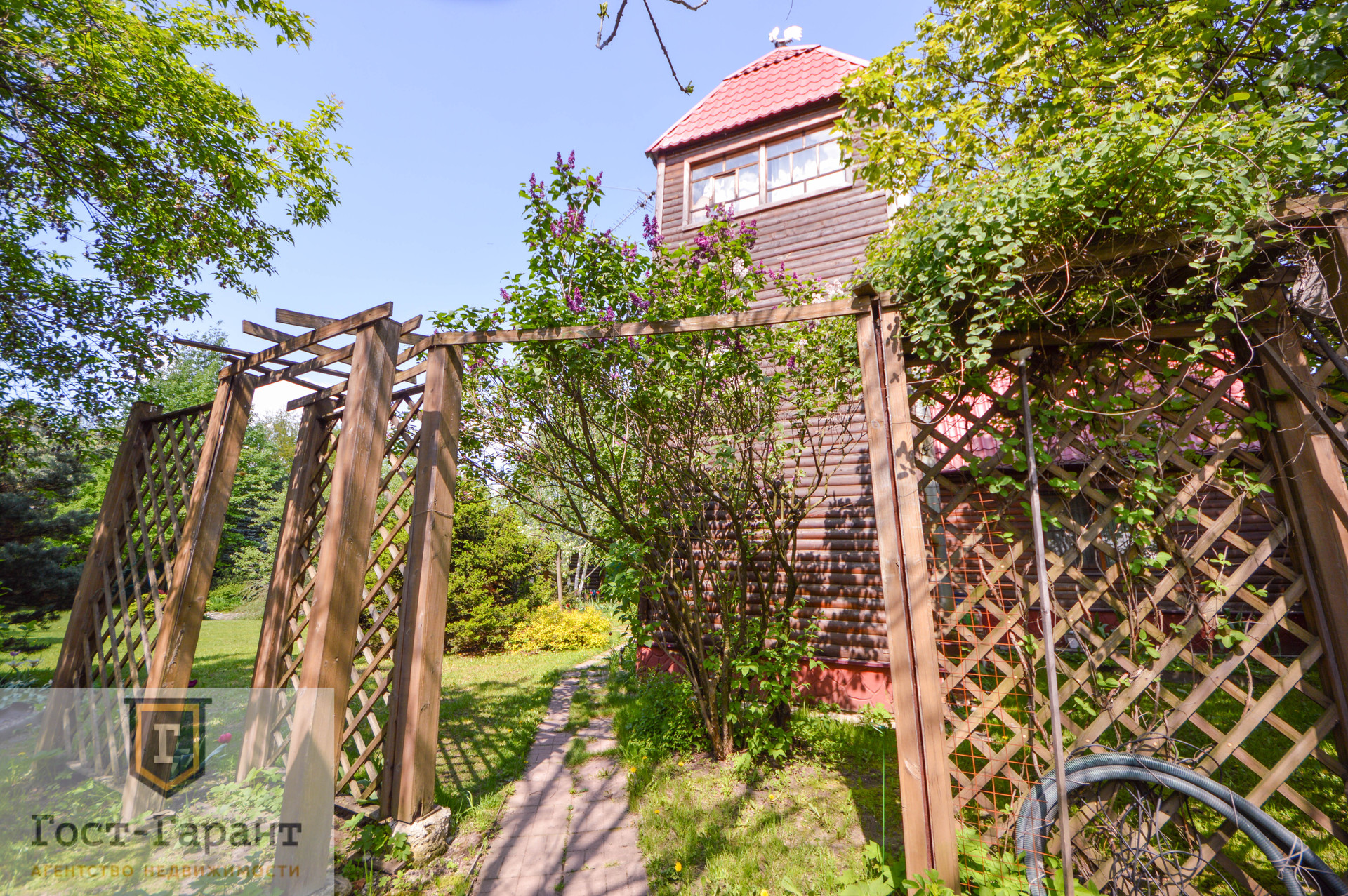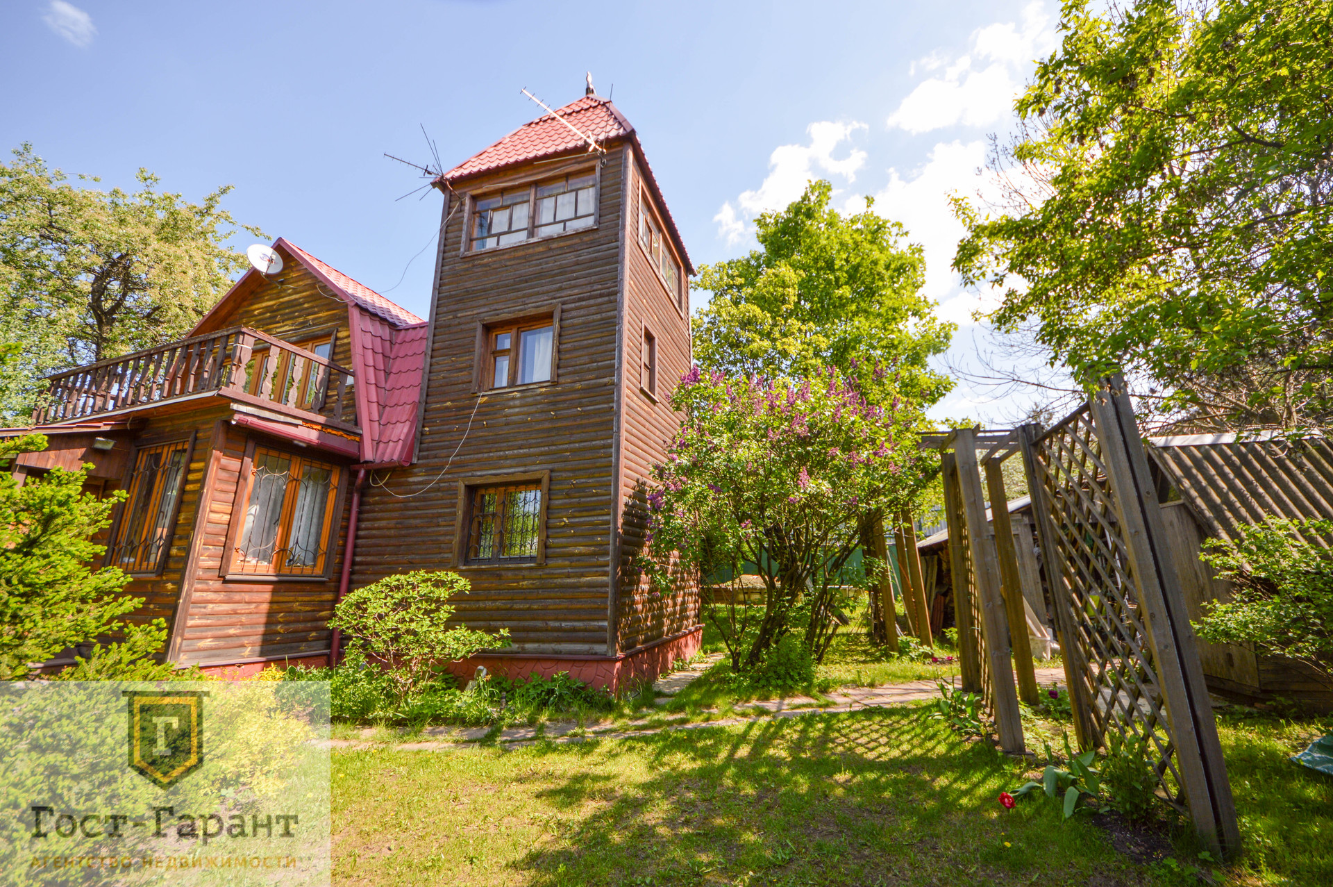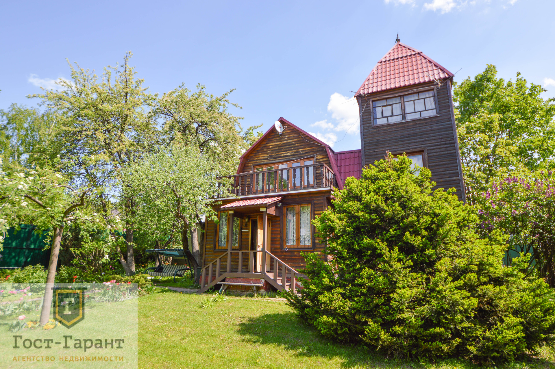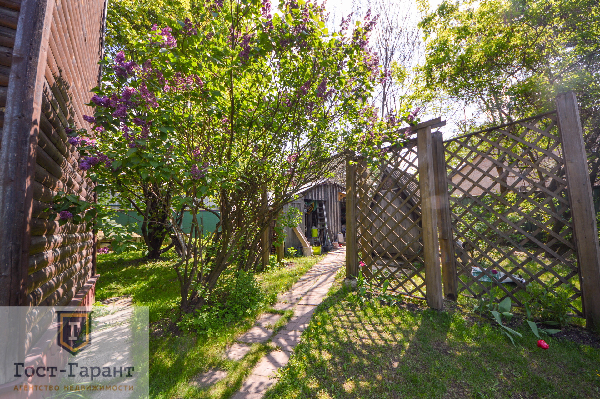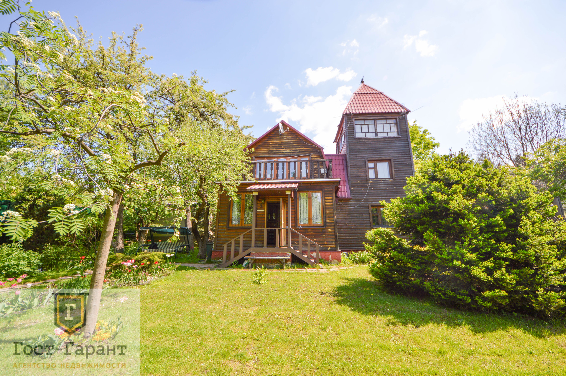 На ухоженном участке с ландшафтным дизайном просторный газон, по периметру высажены большие деревья (канадские сосны, голубые ели, каштаны, различные виды кленов и др.), разбиты клумбы с цветущими многолетниками, небольшой декоративный пруд. Есть плодоносящий сад (яблоки, вишни, черешни, малина, смородина, крыжовник и пр.), а также гараж, сарай и баня с большой верандой и зоной отдыха у пруда.