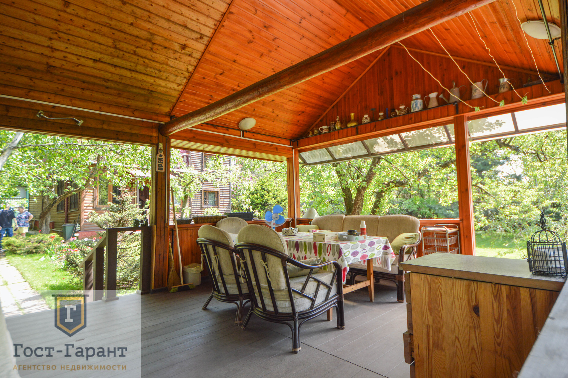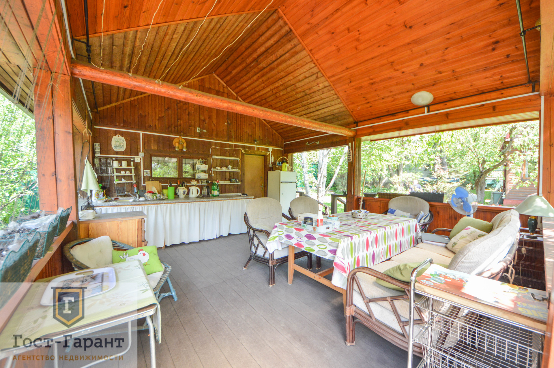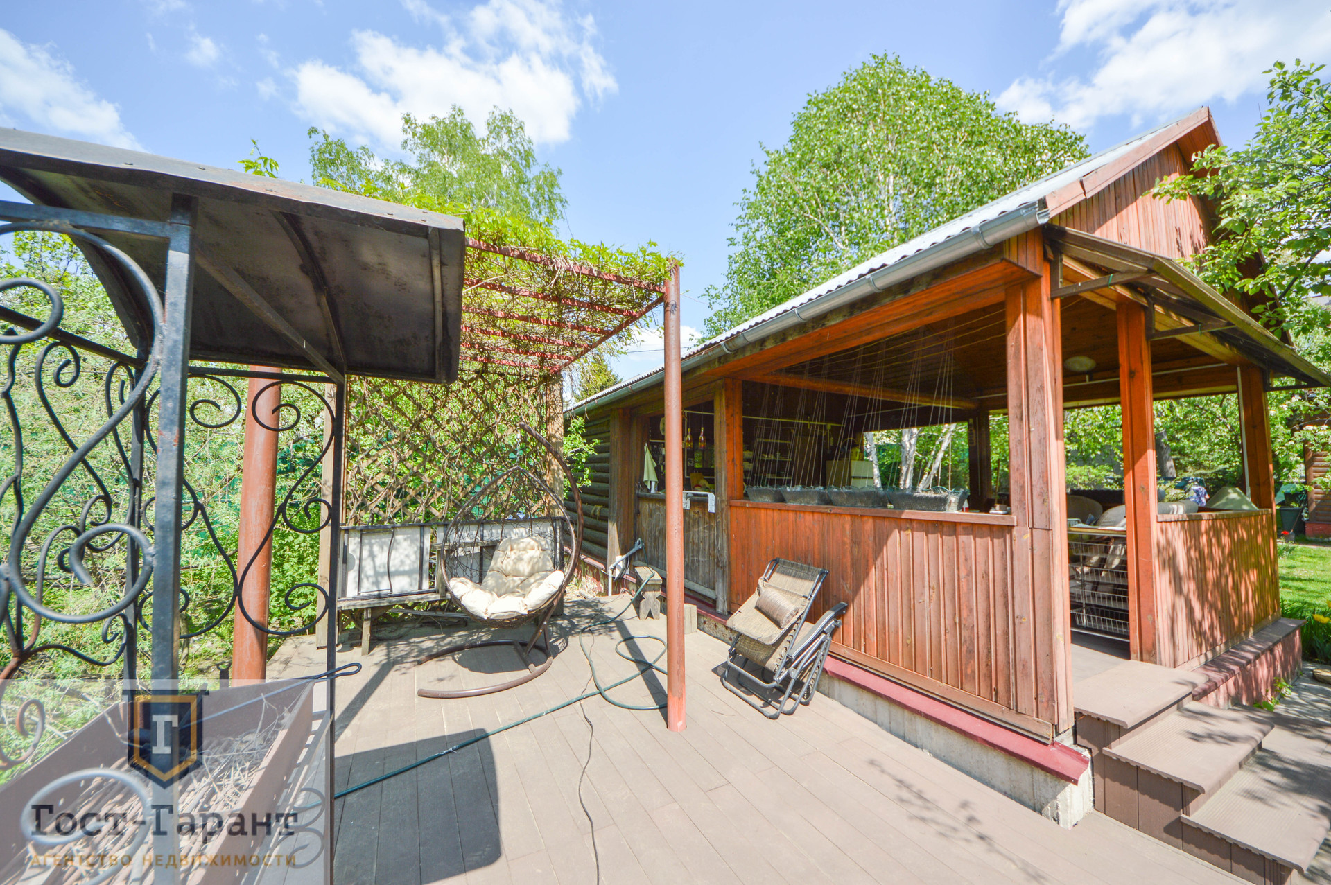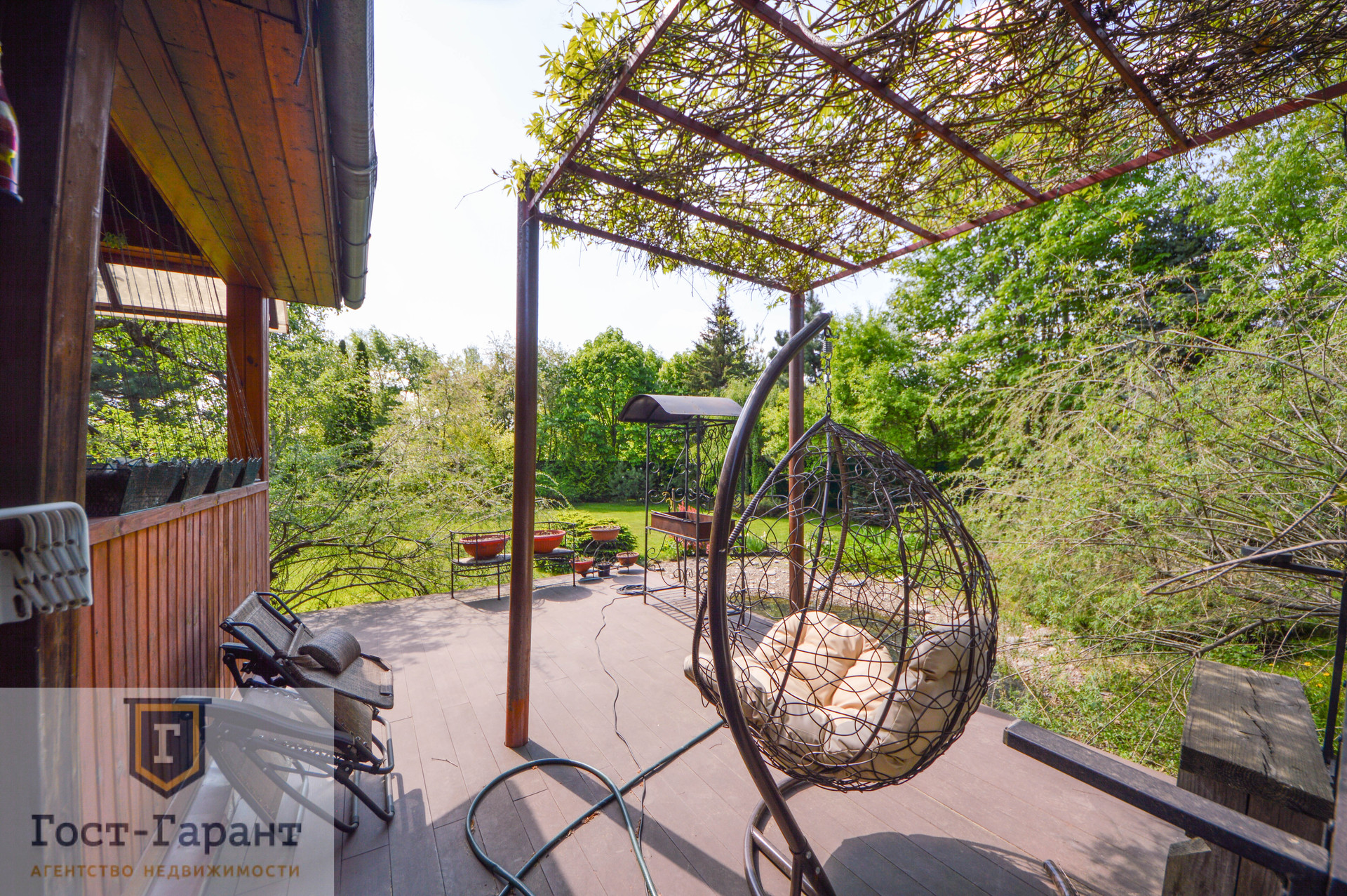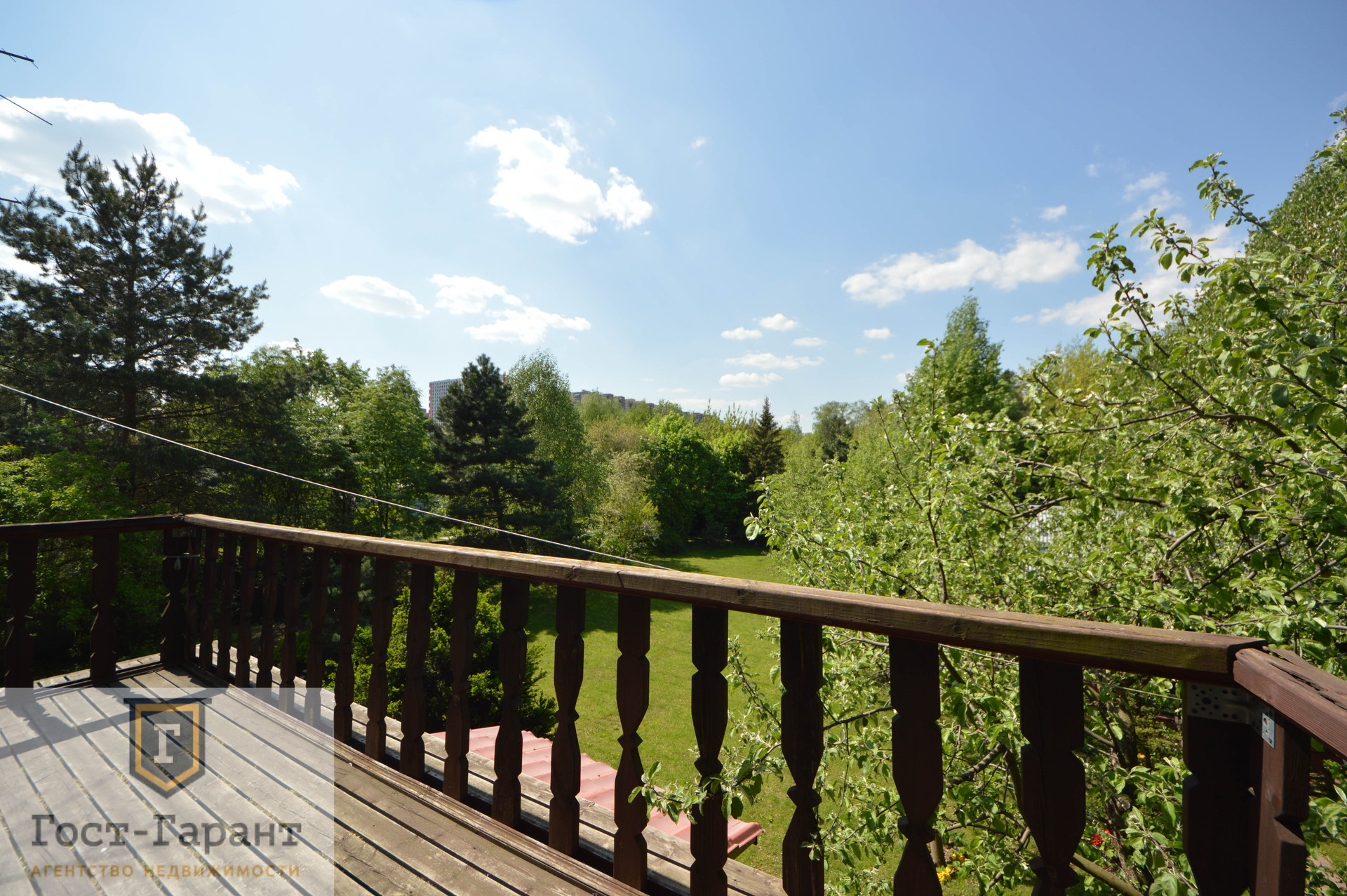 На ухоженном участке с ландшафтным дизайном просторный газон, по периметру высажены большие деревья (канадские сосны, голубые ели, каштаны, различные виды кленов и др.), разбиты клумбы с цветущими многолетниками, небольшой декоративный пруд. Есть плодоносящий сад (яблоки, вишни, черешни, малина, смородина, крыжовник и пр.), а также гараж, сарай и баня с большой верандой и зоной отдыха у пруда.