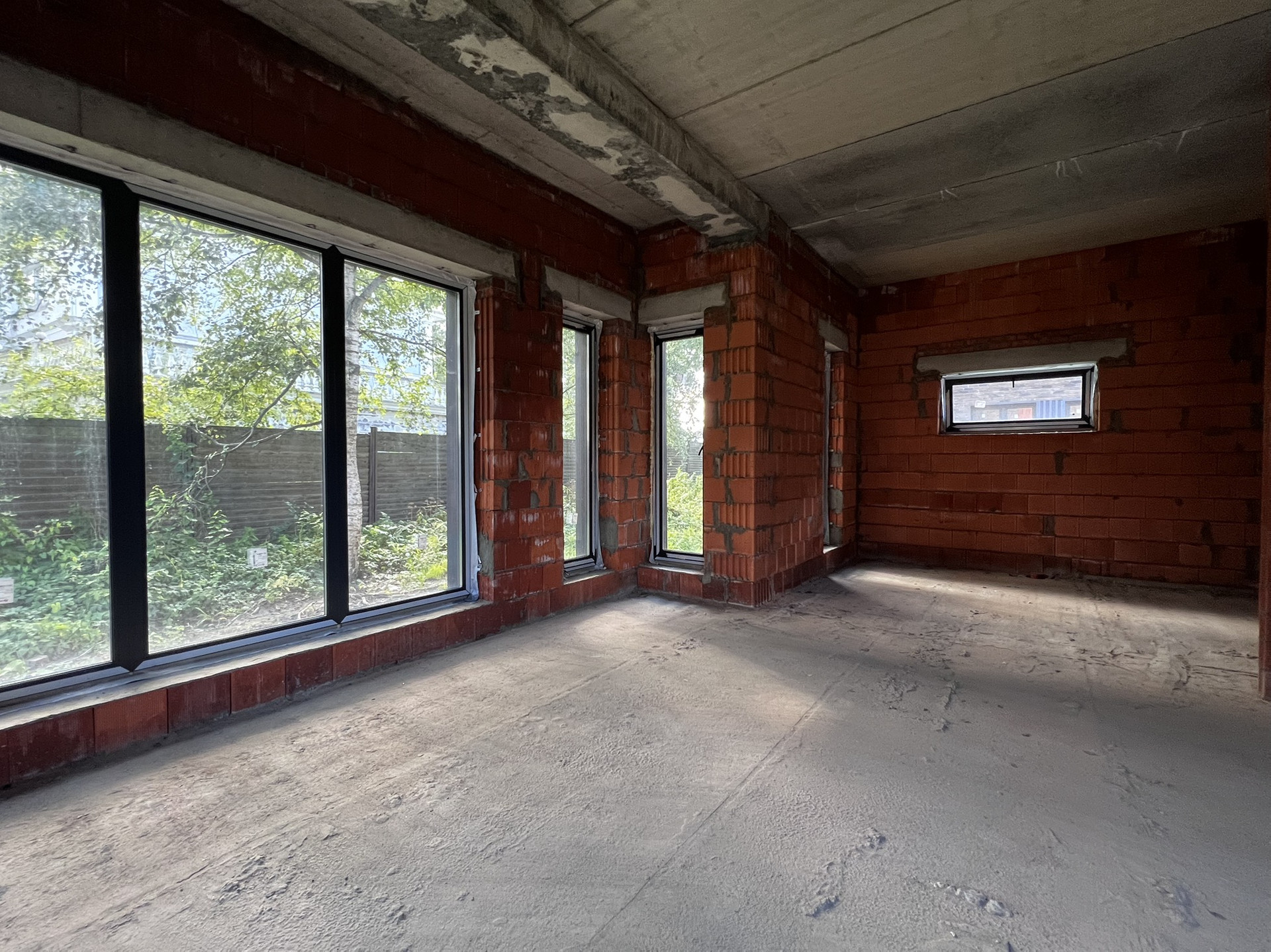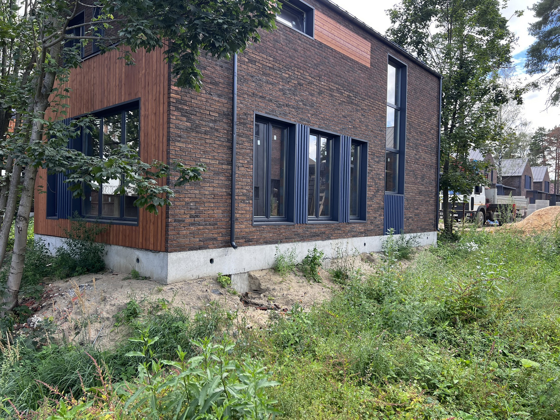 В доме выполнено панорамное остекление, высокие потолки, хорошая шумоизоляция, теплоизоляция. Дом построен из кирпича ручной формовки, керамических блоков и древесины лиственницы.