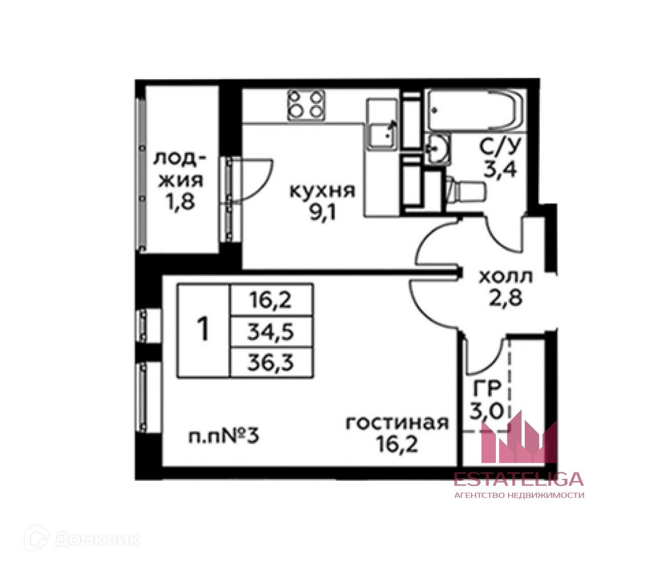 Общая площадь 36 м2