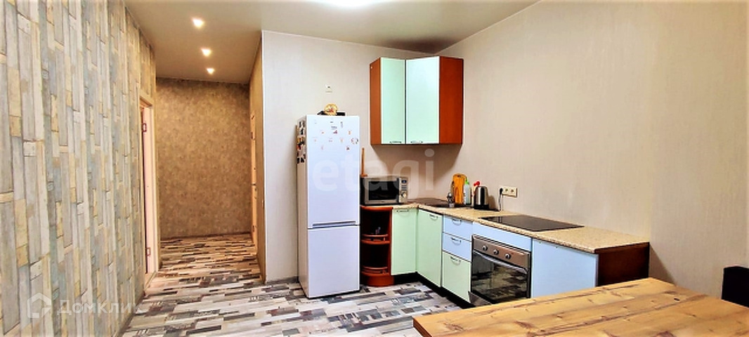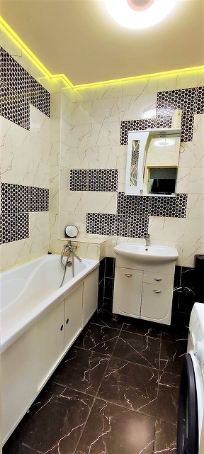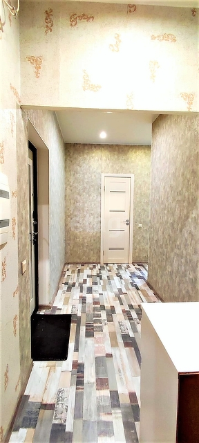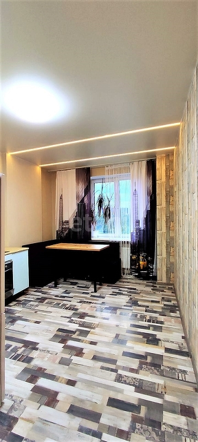 Выполнен современный ремонт- выровнены стены, на полу ламинат, на стенах обои, потолок натяжной с дополнительным светодиодным освещением. Кухня-гостинная - 14,5 кв м