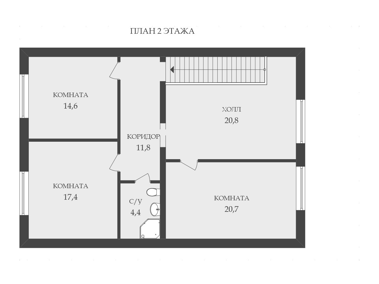 2 этаж: 3 жилые комнаты (20,7; 17,4 и 14,6 кв.м.), жилой холл (20,8 кв.м.), коридор (11,8 кв.м.) и санузел (4,4 кв.м.).