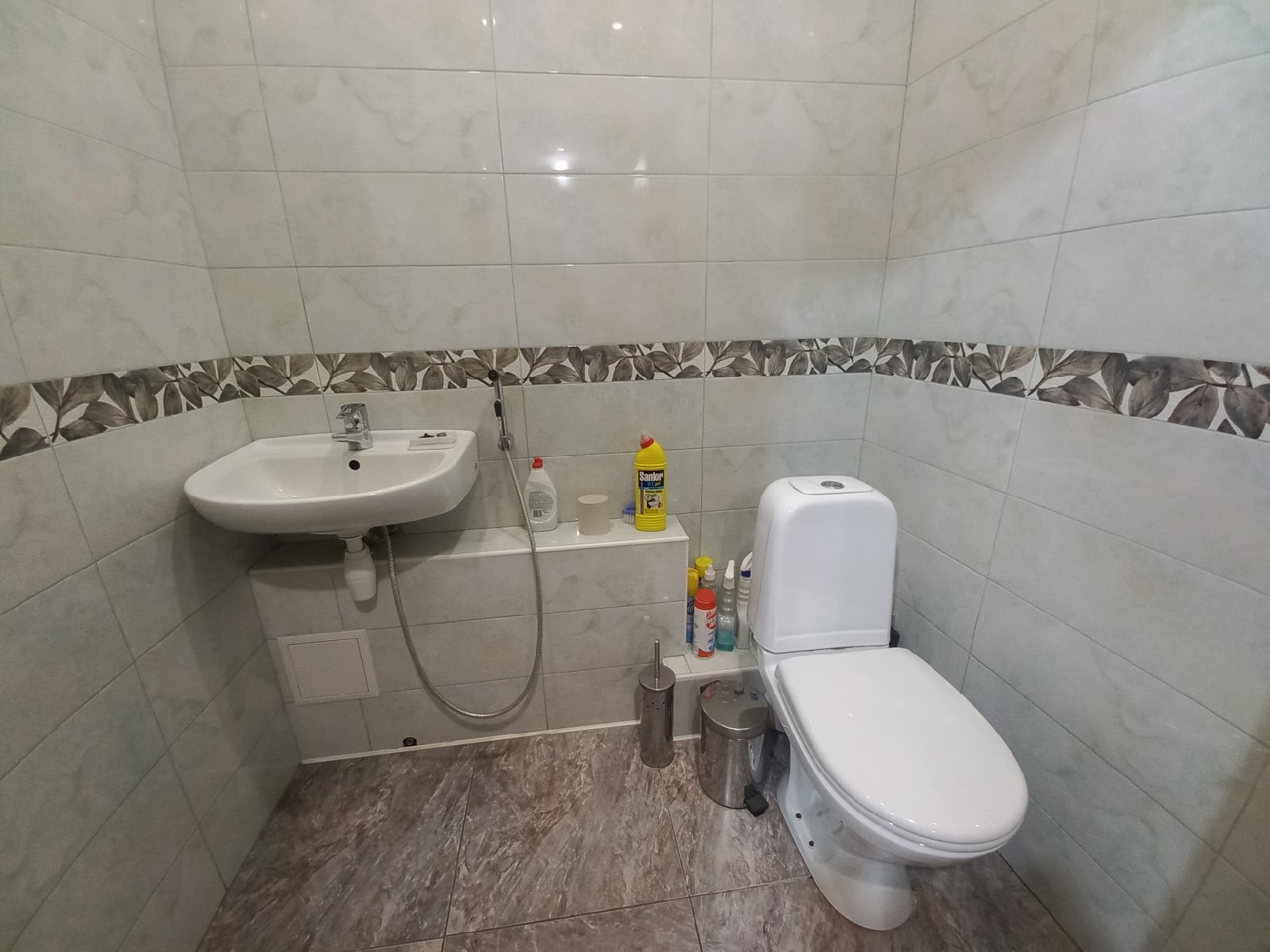 На 1 этаже аккуратный санузел с унитазом и раковиной с гигиеническим душем-биде.