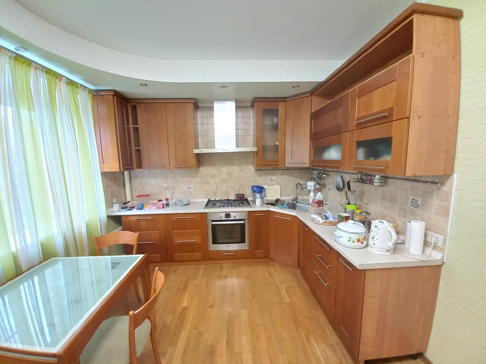 Стильный кухонный гарнитур с современной варочной панелью и отличным духовым шкафом.