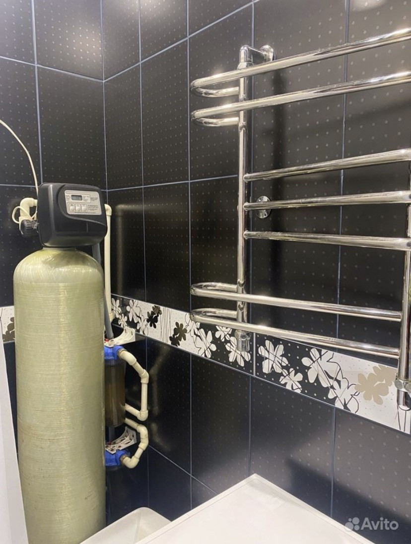 Новая ванна и тумба с раковиной. Стоит промышленный фильтр и водонагреватель.