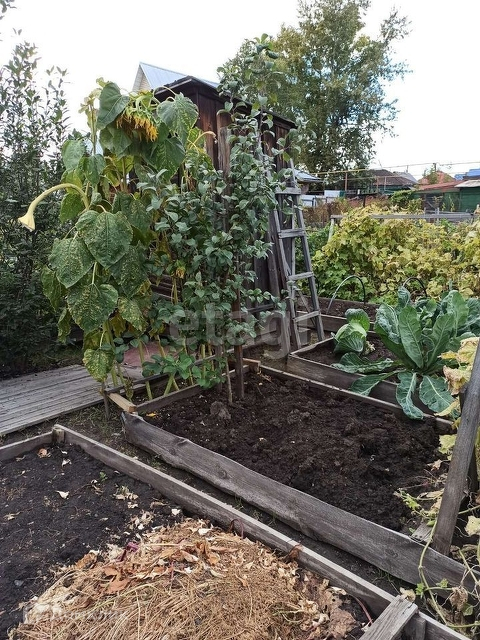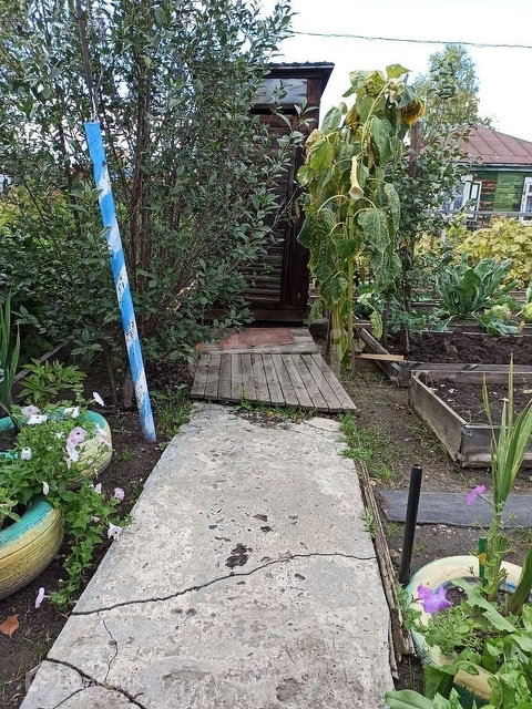 Разработанный огород, перед домом место для парковки.