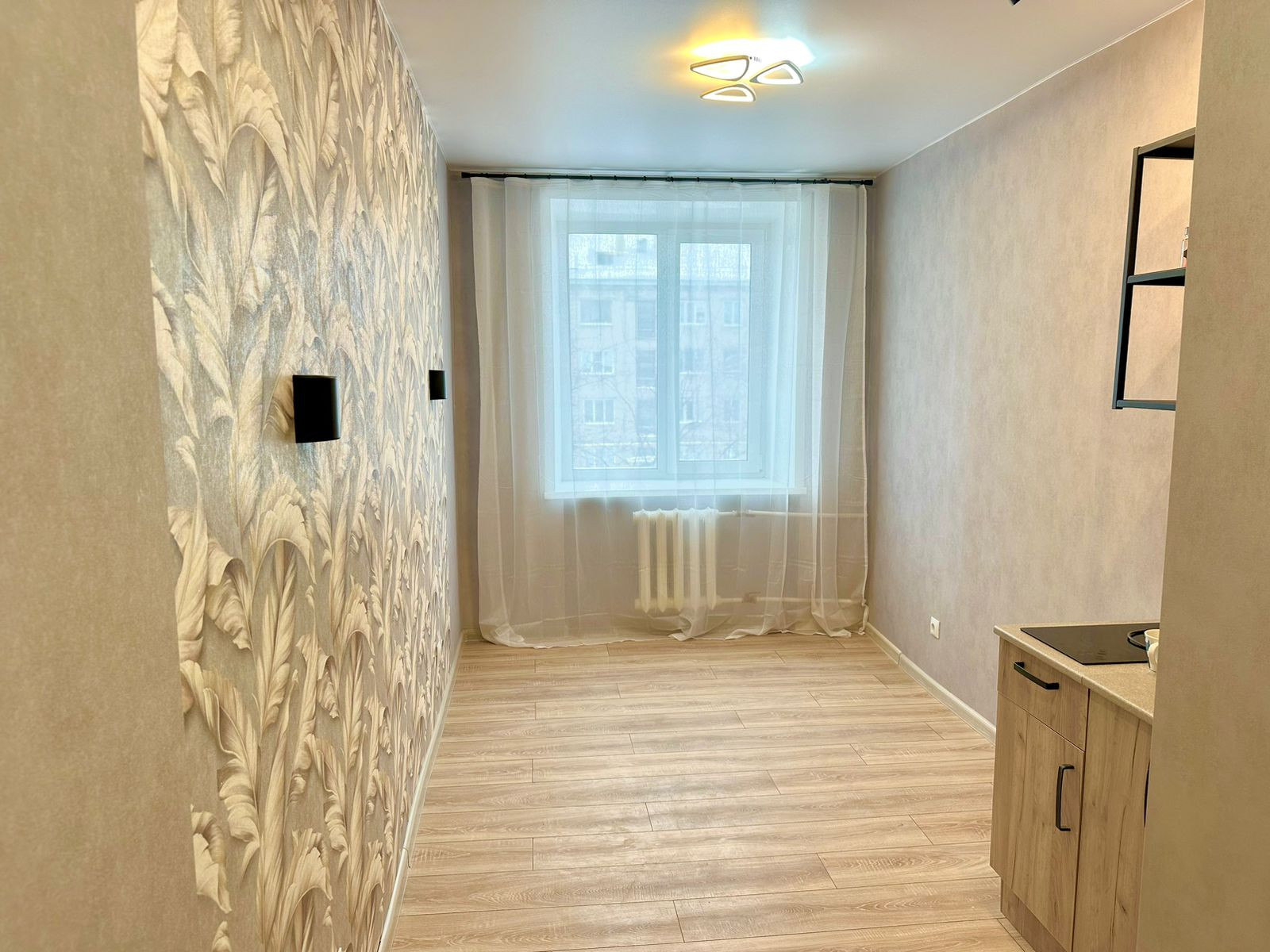 В студии сделан капитальный ремонт: стяжка пола, стены выровнены, новая электрика, натяжной потолок с подсветкой. Студия поделена на зоны: жилая зона - ламинат 32 класса, зона кухни - керамогранит.