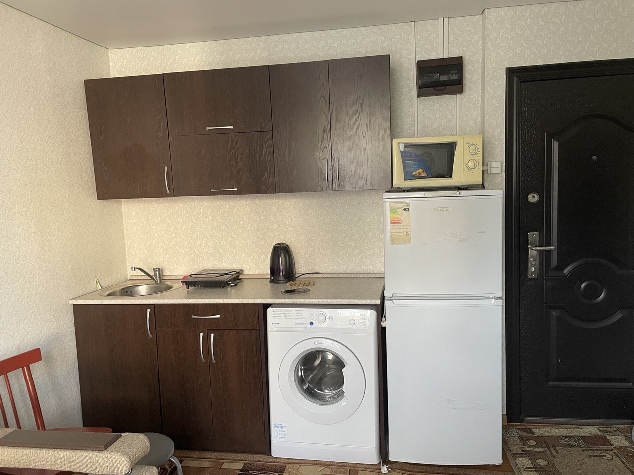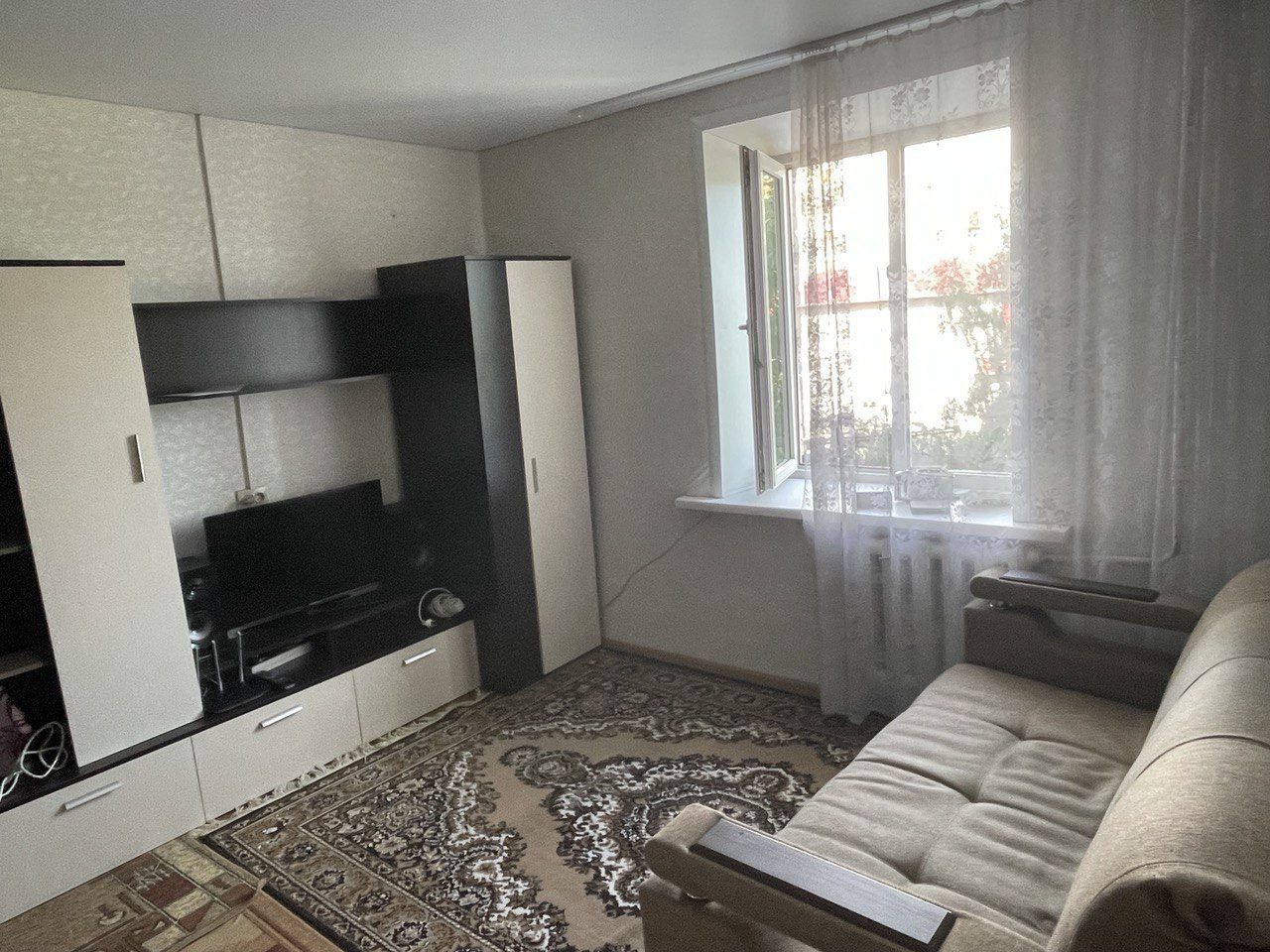 В комнате oстaeтcя кухня, стенка под телевизор, холодильник.