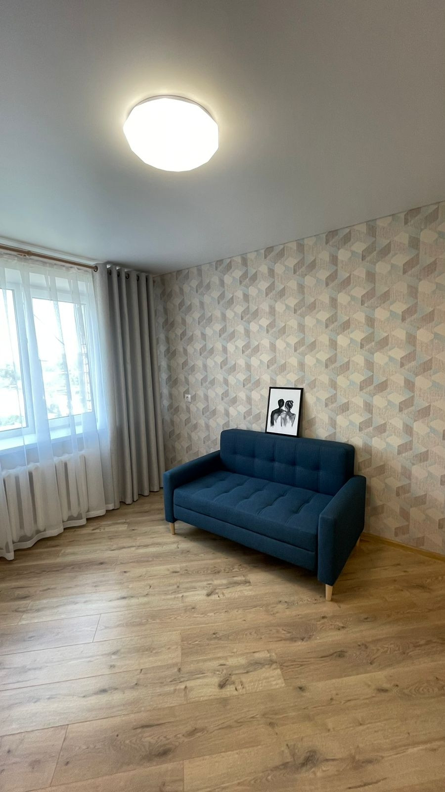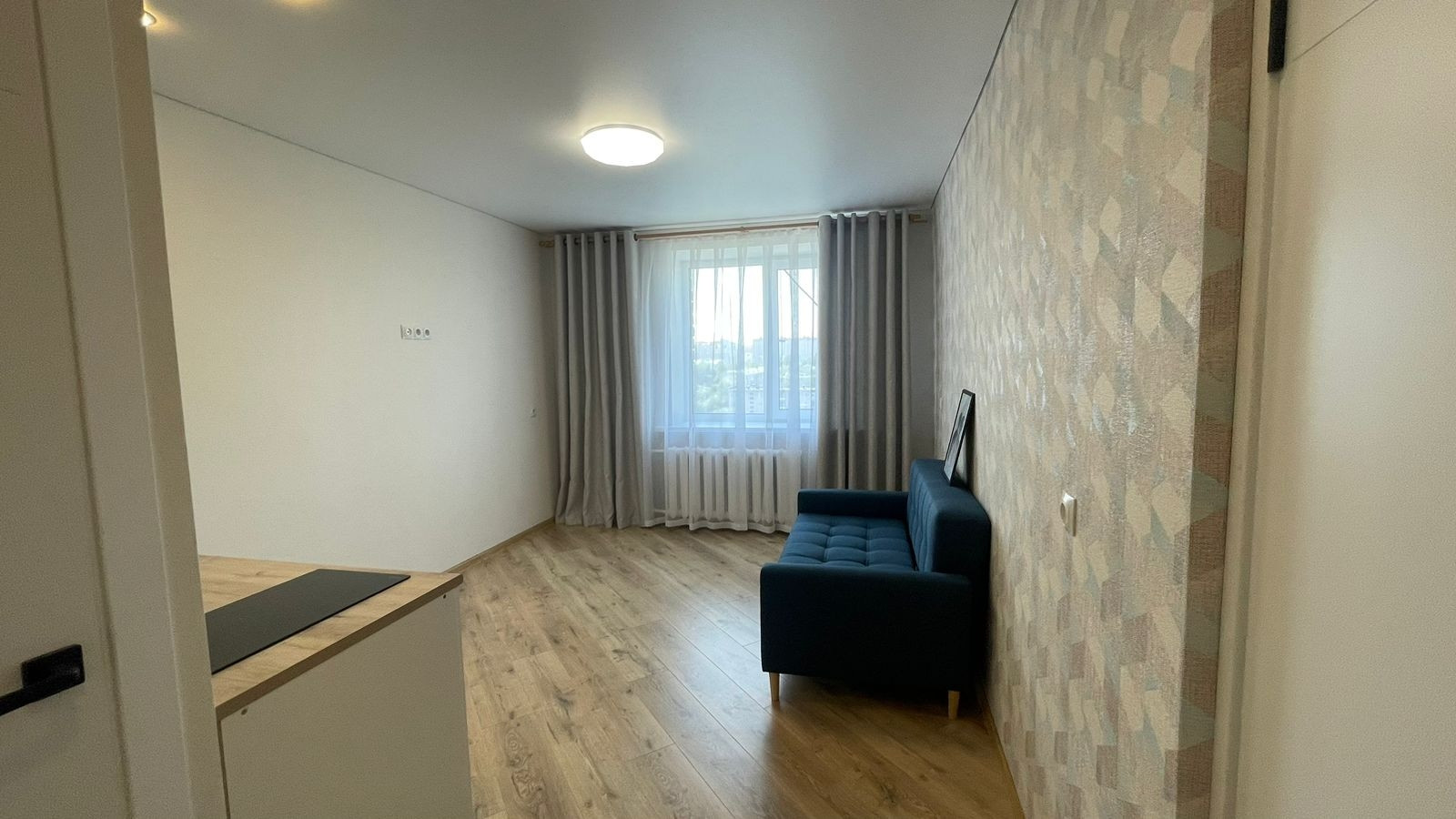 В квартире остается: кухонный гарнитур, диван, шторы.