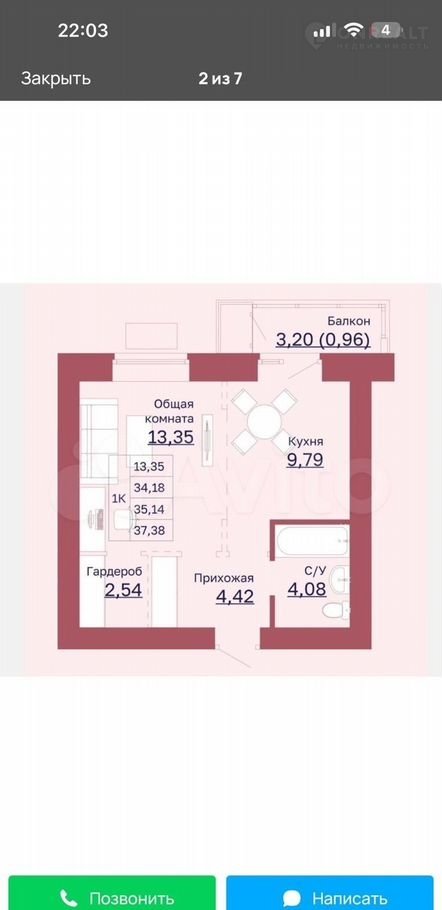 Общая площадь 37 м2