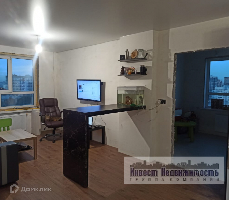 Квартира расположена на самом высоком этаже дома с видом на две стороны, так что открывается обзор и на Павловский тракт, и на Гэлакси и линию горизонта в той части города, и в сторону Ядринцева так, что видно ВДНХ с освещенными вечерами подъемами и часовней. Поскольку во все стороны видно горизонт за чертой города и угол обзора выходит 270 градусов, то можно насладиться великолепным разнообразием закатов, рассветов и просто красивых облаков всех оттенков, и даже проснуться ночью или утром в плотном белом облаке. Окна в квартире большие, подоконники занижены, что так же позволяет любоваться видами. Квартира изначально было евро-3 комнатной, но мы сделали перепланировку, чтобы выделить по комнате каждому ребенку. В результате получилась четырех комнатная квартира со спальней, двумя детскими, гостиной и кухней. Так же выделена небольшая комната для стиральной машины и сушилок под белье, в ней же заведены трубы и провода под водонагреватель (мы купить не успели). Чтобы кухня не была маленькой, мы соеденили ее с гостинной, зонировав барной стойкой. В квартире полностью подготовлены стены для окрашивания или поклейки обоев, во всех комнатах сделан подвесной потолок и постелен ламинат (33 класс), поставлены барная стойка и кухонный гарнитур. Стиральная и ванная комнаты полностью подготовлены, не считая дверных проемов. Остальные комнаты требуют обоев (возможно, краски, штукатурки), плинтусов и дверей. Так же мы выделили гардеробную комнату, чтобы не захламлять спальные комнаты вещами и чтобы было куда убрать лишние вещи.