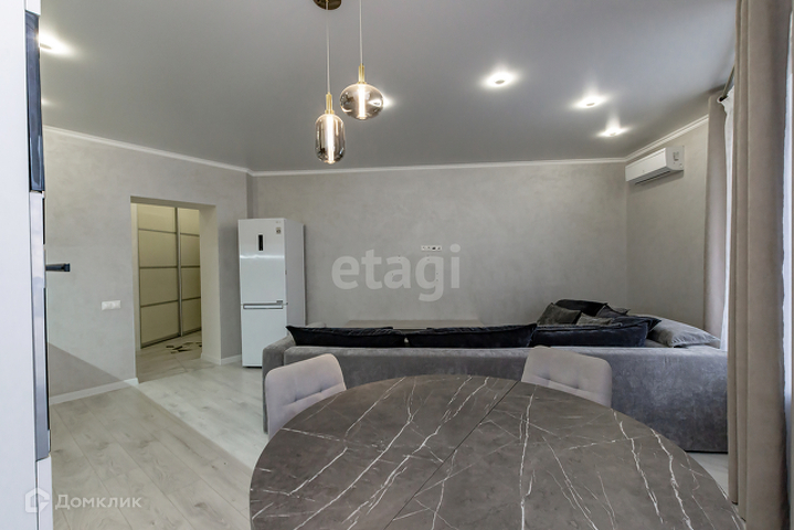 Гостиная и кухня представляют собой единое пространство гармонично сочетая зону отдыха и обеденную зону.