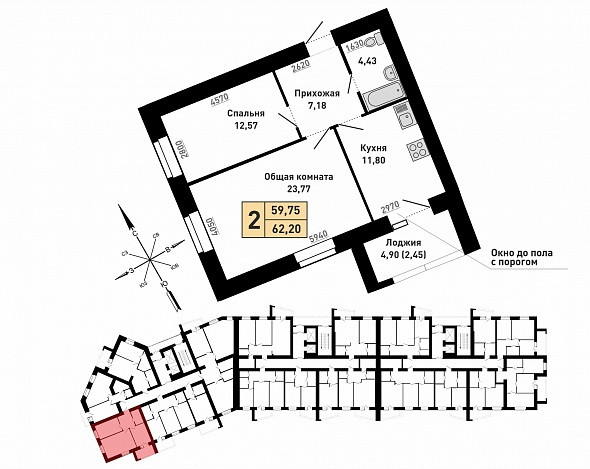 2-комнатная квартира, 61 м2, этаж 2 / 16, на продажу в Барнауле, улица Энтузиастов, 59