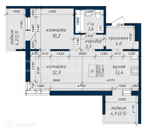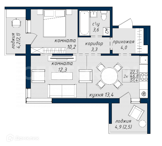 Общая площадь 51.4 м2