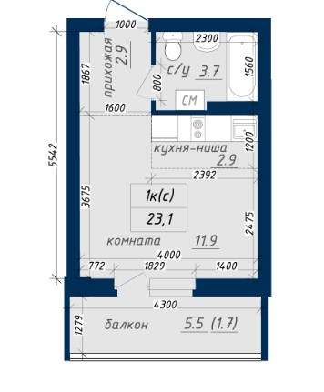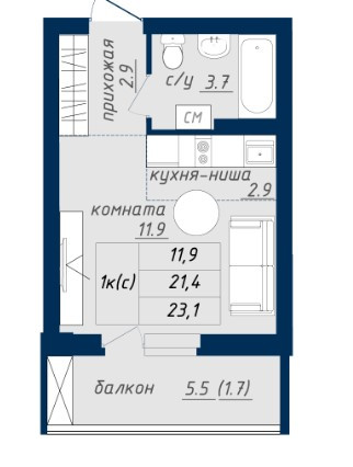 Общая площадь 23.1 м2