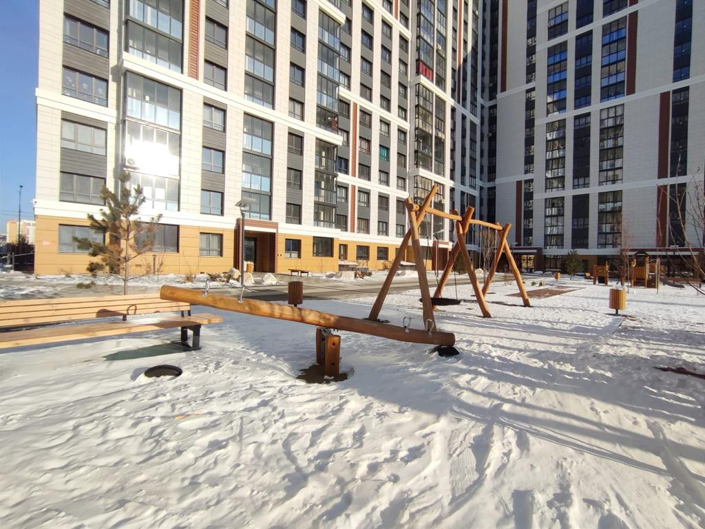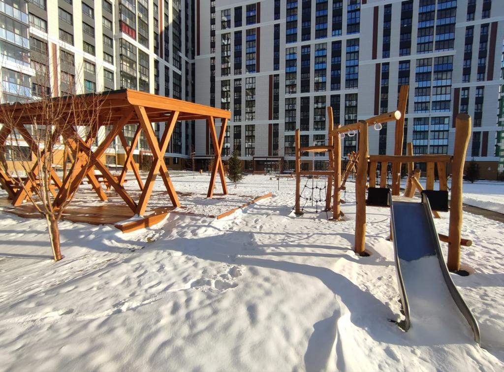 Огромная детская площадка со специальным покрытием изолирована от проезжей части.