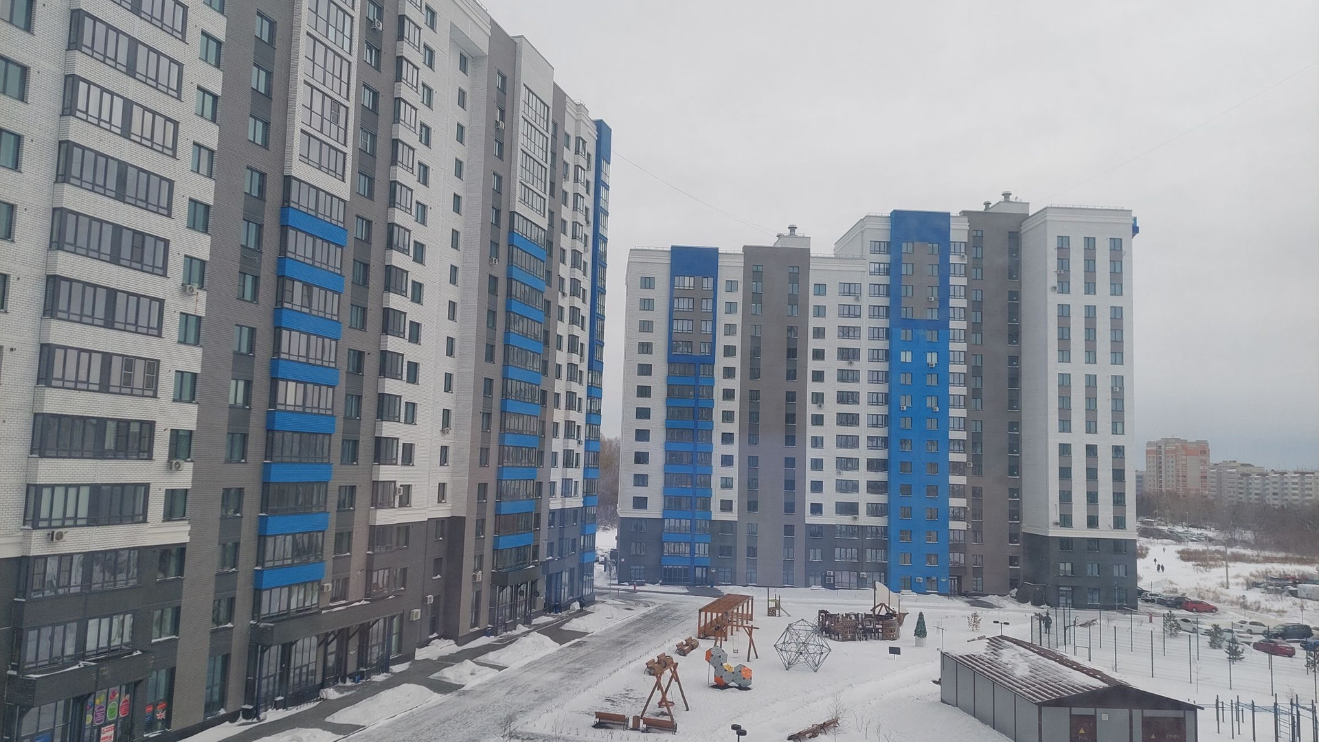 Во дворе - несколько игровых зон для детей, отдыха взрослых, хозяйственных целей, а также спортивная коробка, тренажерная площадка и велосипедные дорожки. С уличной стороны высоток предусмотрены автопарковки.
