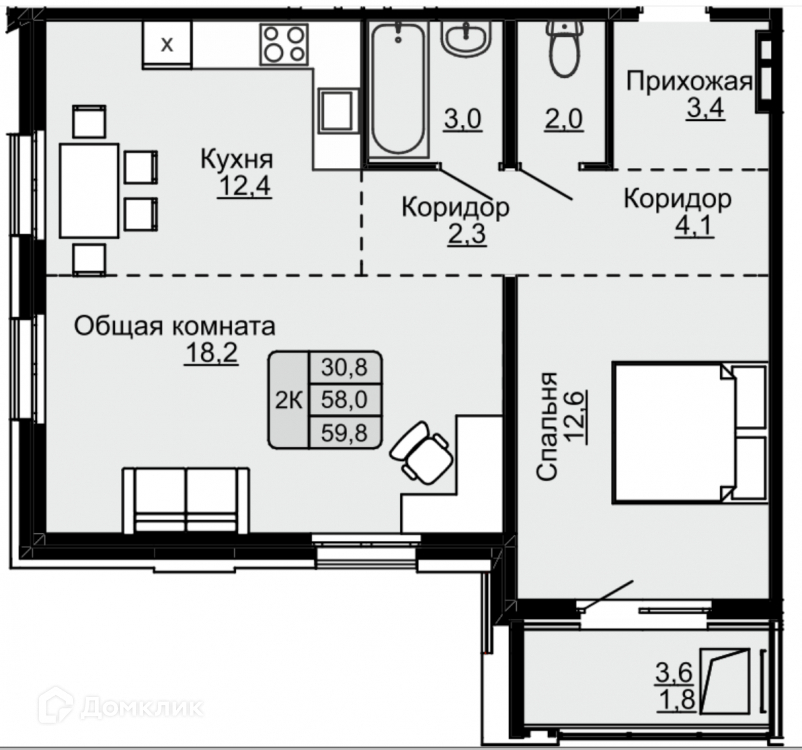 Общая площадь 58 м2