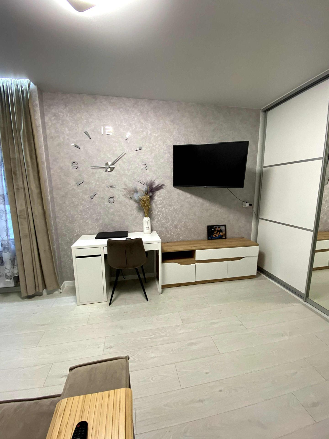 В зоне коридора и гостиной установлены встроенные шкафы, которые останутся в квартире.