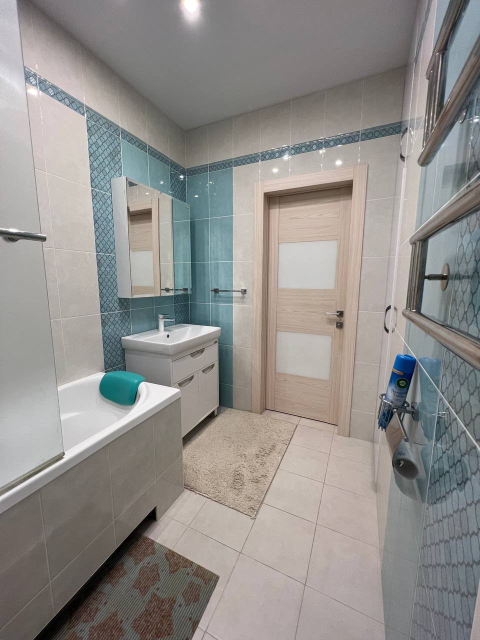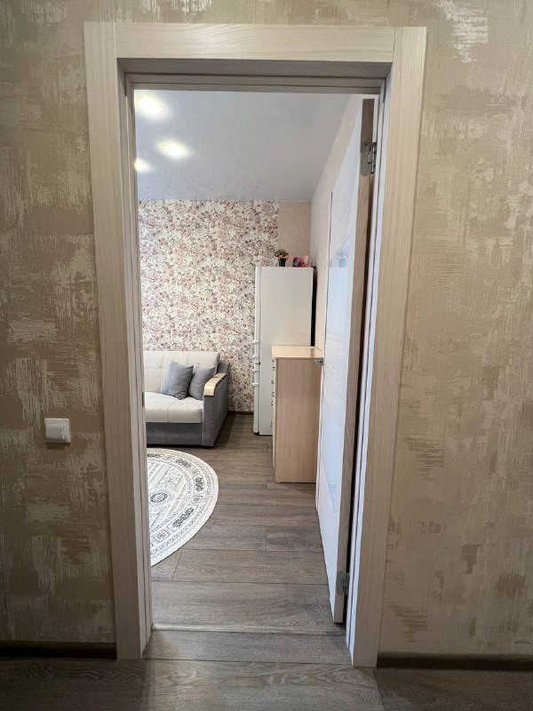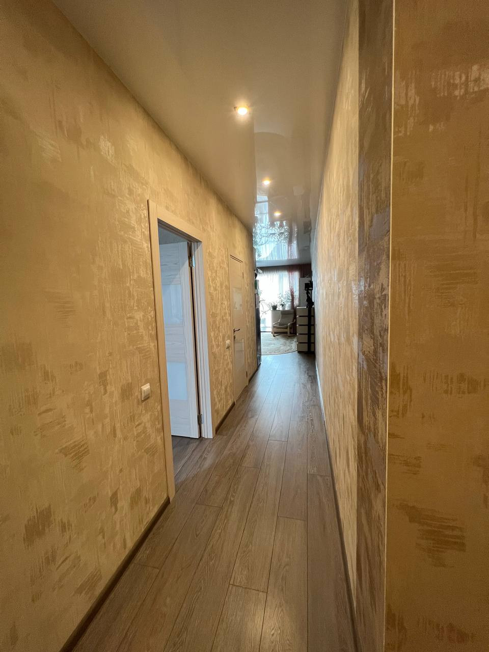 В квартире выполнен качественный ремонт. На полу по всей квартире лежит ламинат, в прихожей керамогранит, в ванной кафель. Везде натяжные потолки. Межкомнатные двери фирмы Волховец.