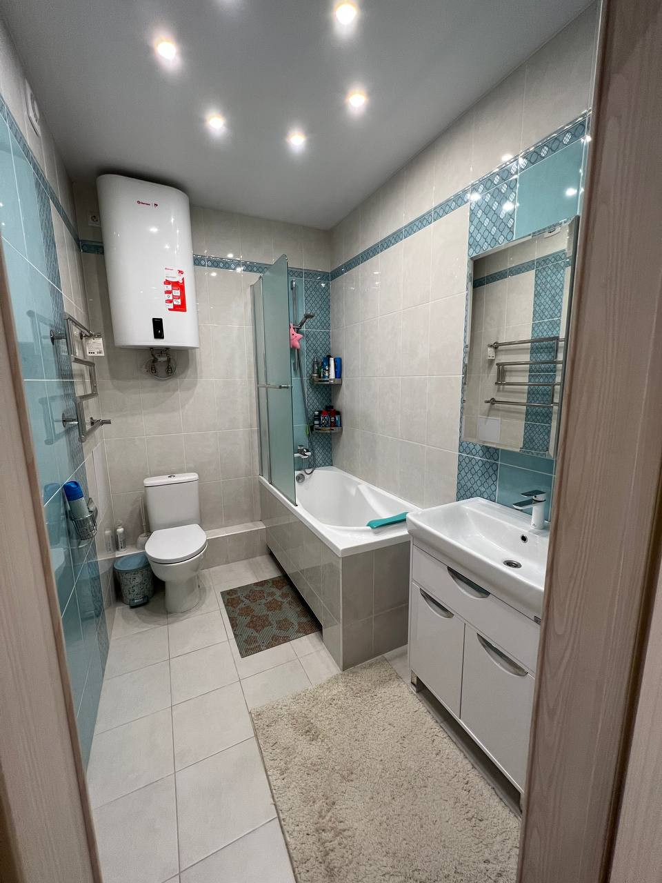 В ванной комнате установлена акриловая ванна, сантехника (фирмы Кайзер Германия), теплый пол, водонагреватель Термекс ( также остается).