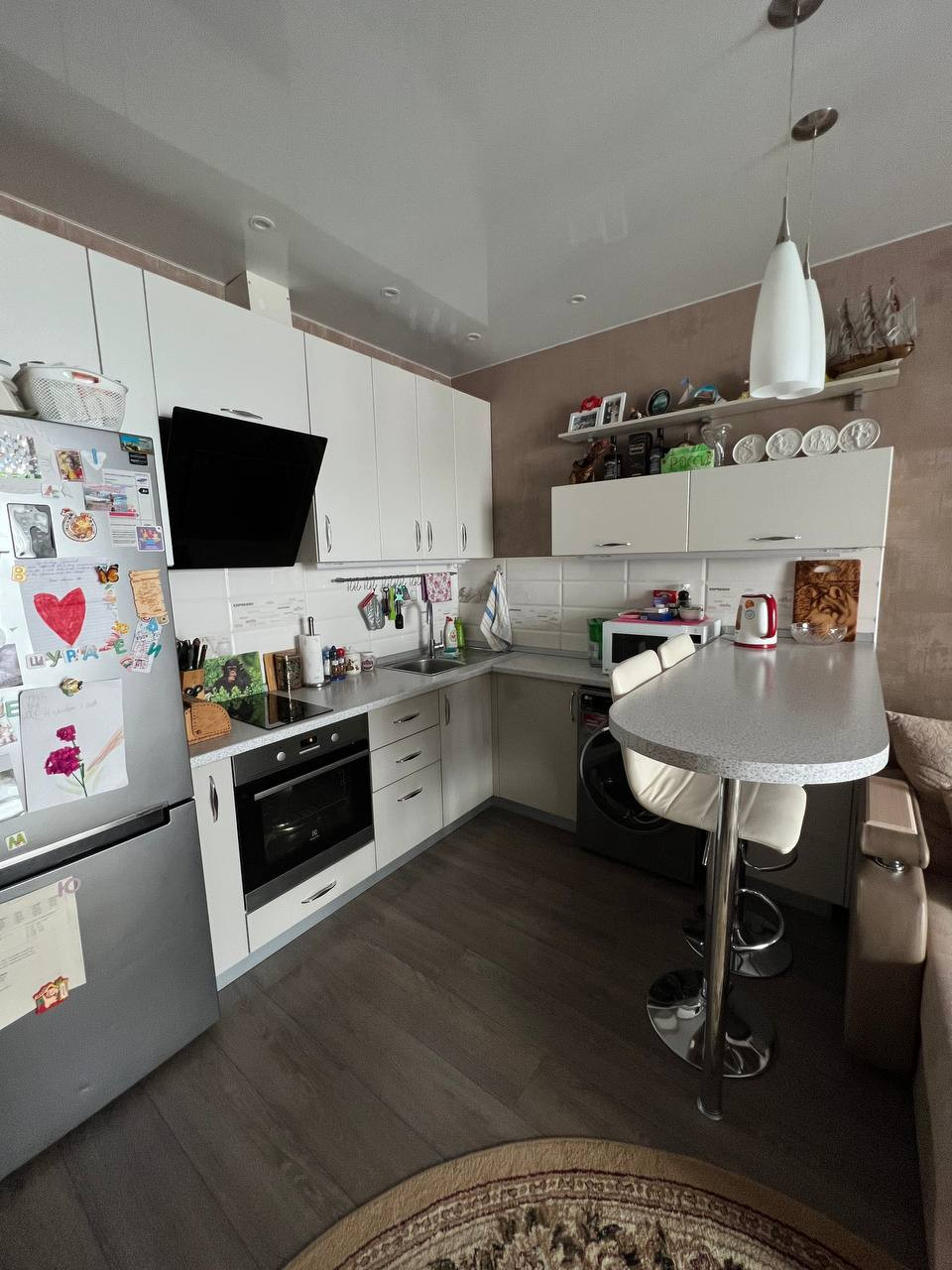 В общей комнате встроенный кухонный гарнитур с варочной панелью и духовым шкафом фирмы Электролюкс, а также вытяжка. Кухонный гарнитур остается вместе с указанной ранее техникой.